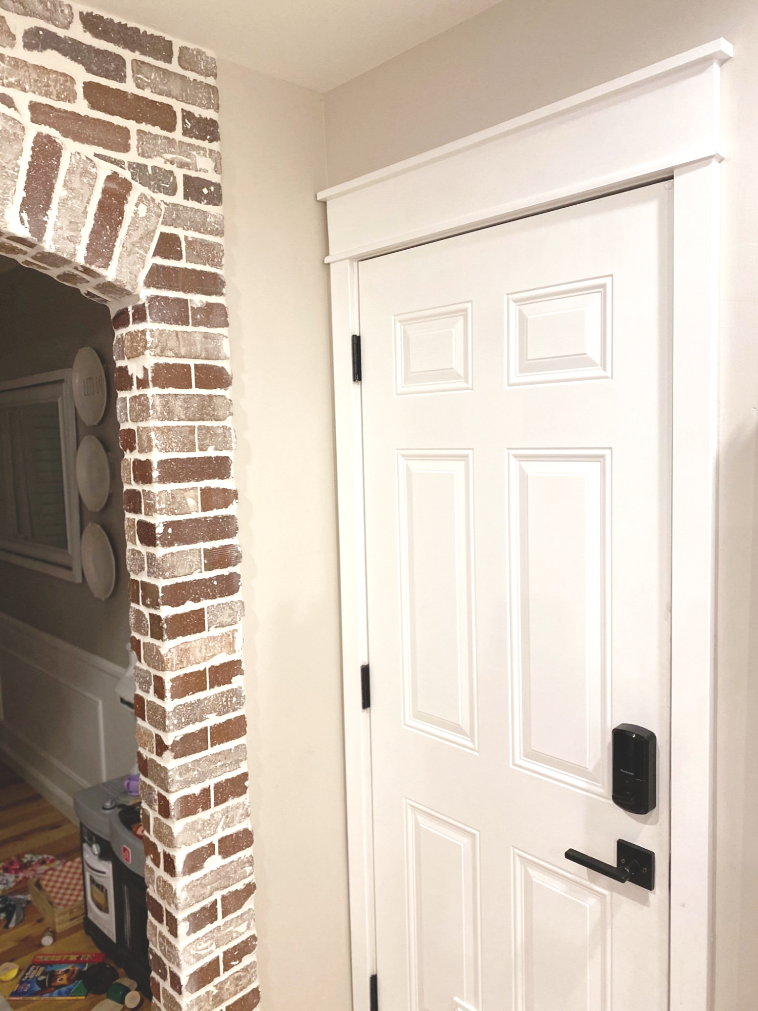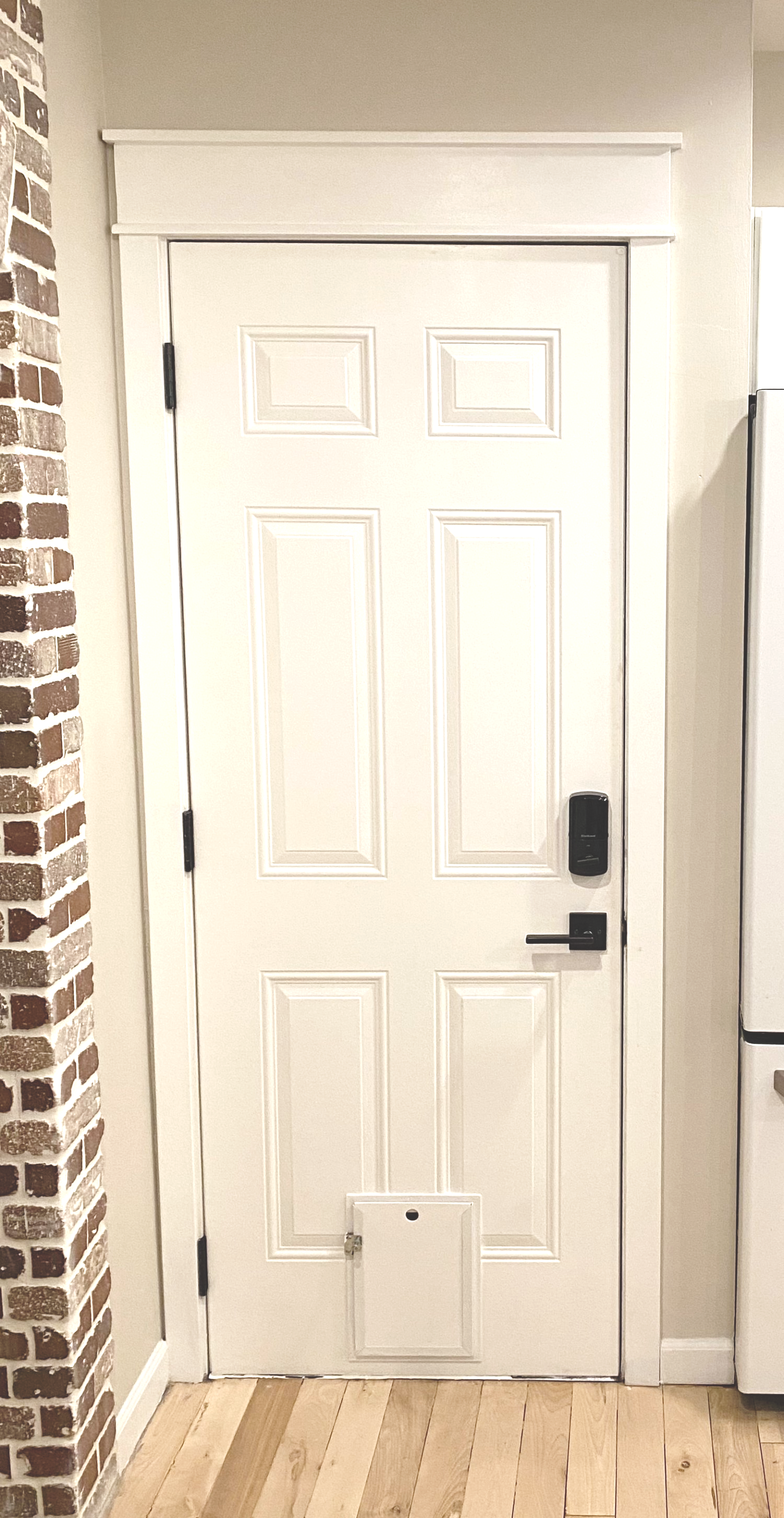 We also installed new, bigger trim, and I’m happy to report that the new hardware actually works! High-fives all around! 🙂 We decided to get a keyless entry pad lock because we wanted to be able to lock and unlock the door without fumbling with keys, which has been so nice. The lock also has a bluetooth feature, which we haven’t set up yet (face-palm!), but it should be able to lock automatically when we are out of range (i.e. the garage) — cool, right??