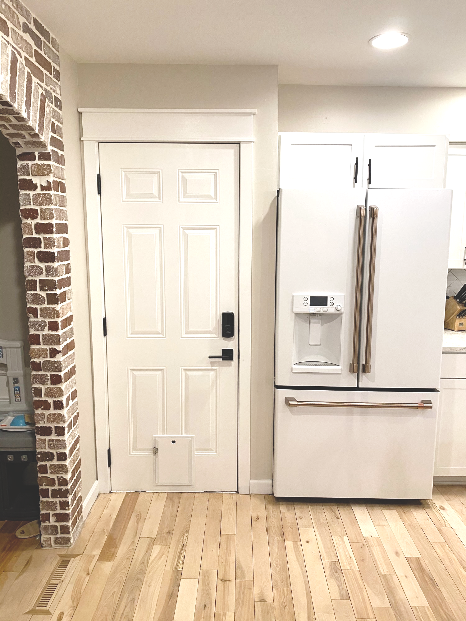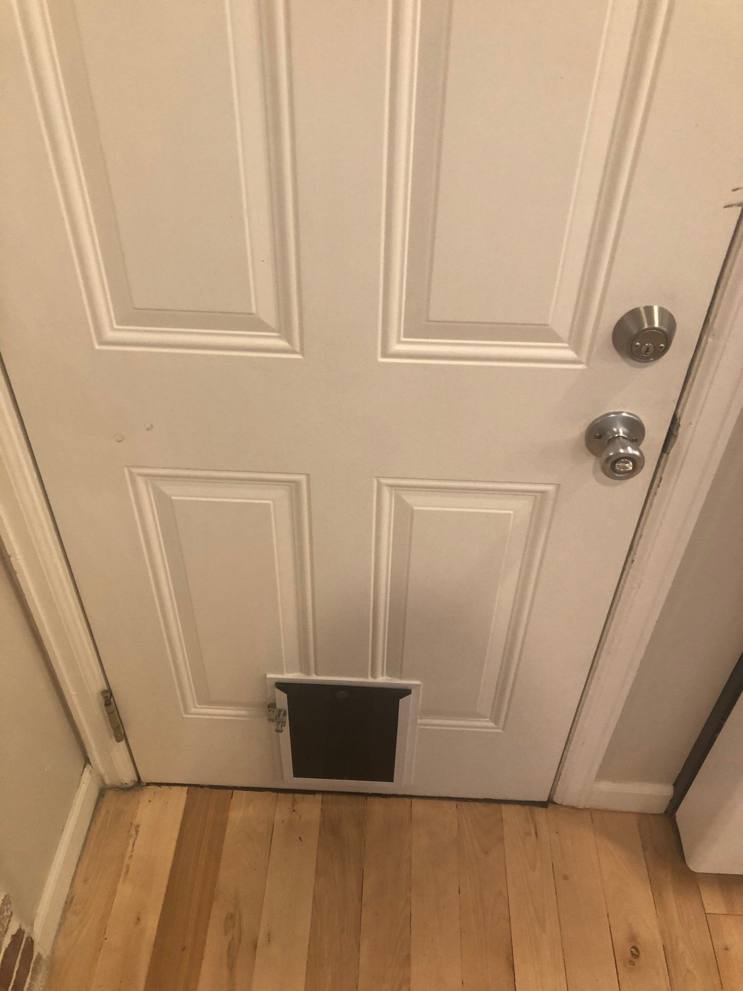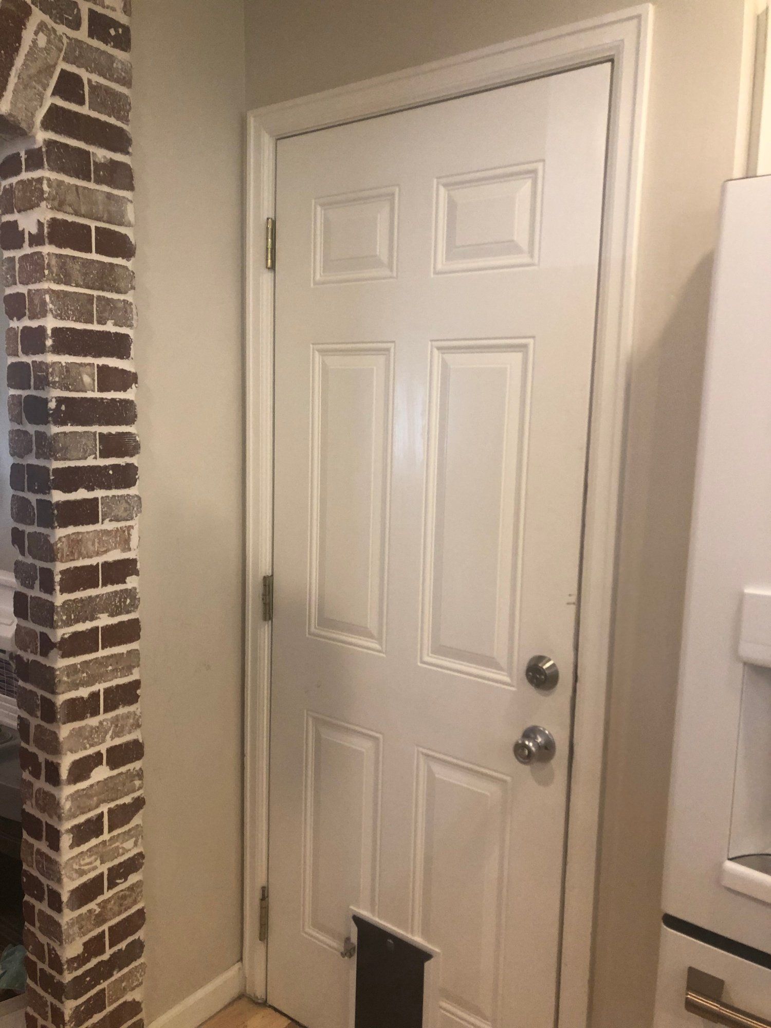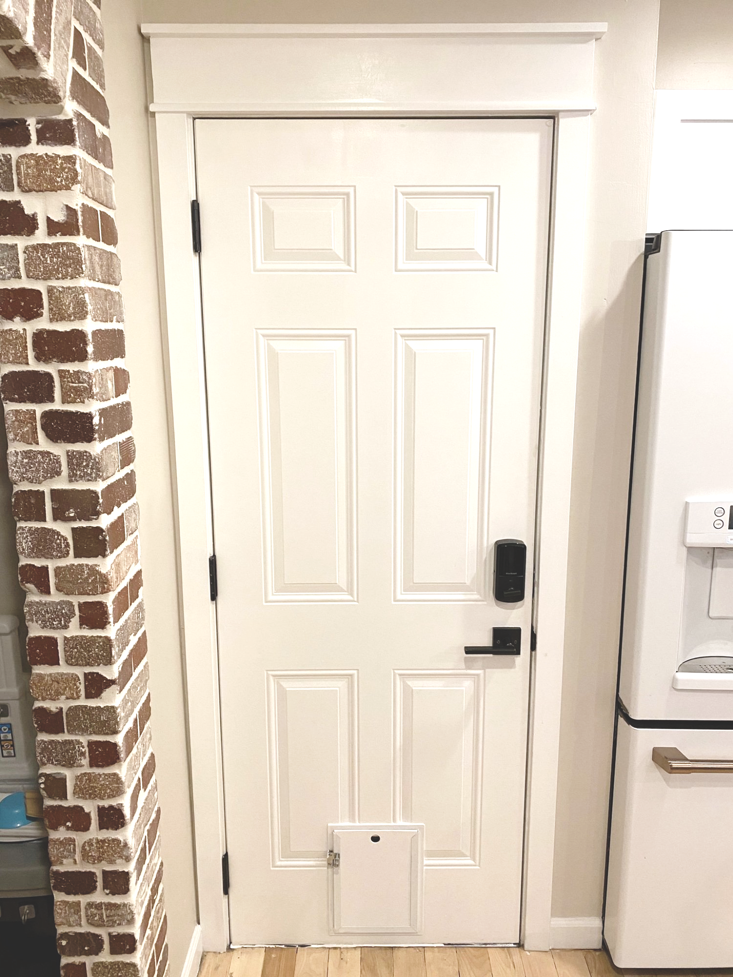 There were two doors in our house that needed some help. The first one, the door to our garage… ay-yay-yay, where do I begin? The door handle would get stuck often and become impossible to twist. So, basically, we felt locked IN our own house. Secondly, the cat door. Need I say more? We do not own a cat. Unfortunately you can’t really undo a thing like this, and buying a new door altogether seemed a little unnecessary (wood prices have gone way up due to COVID), but we needed to do SOMETHING.