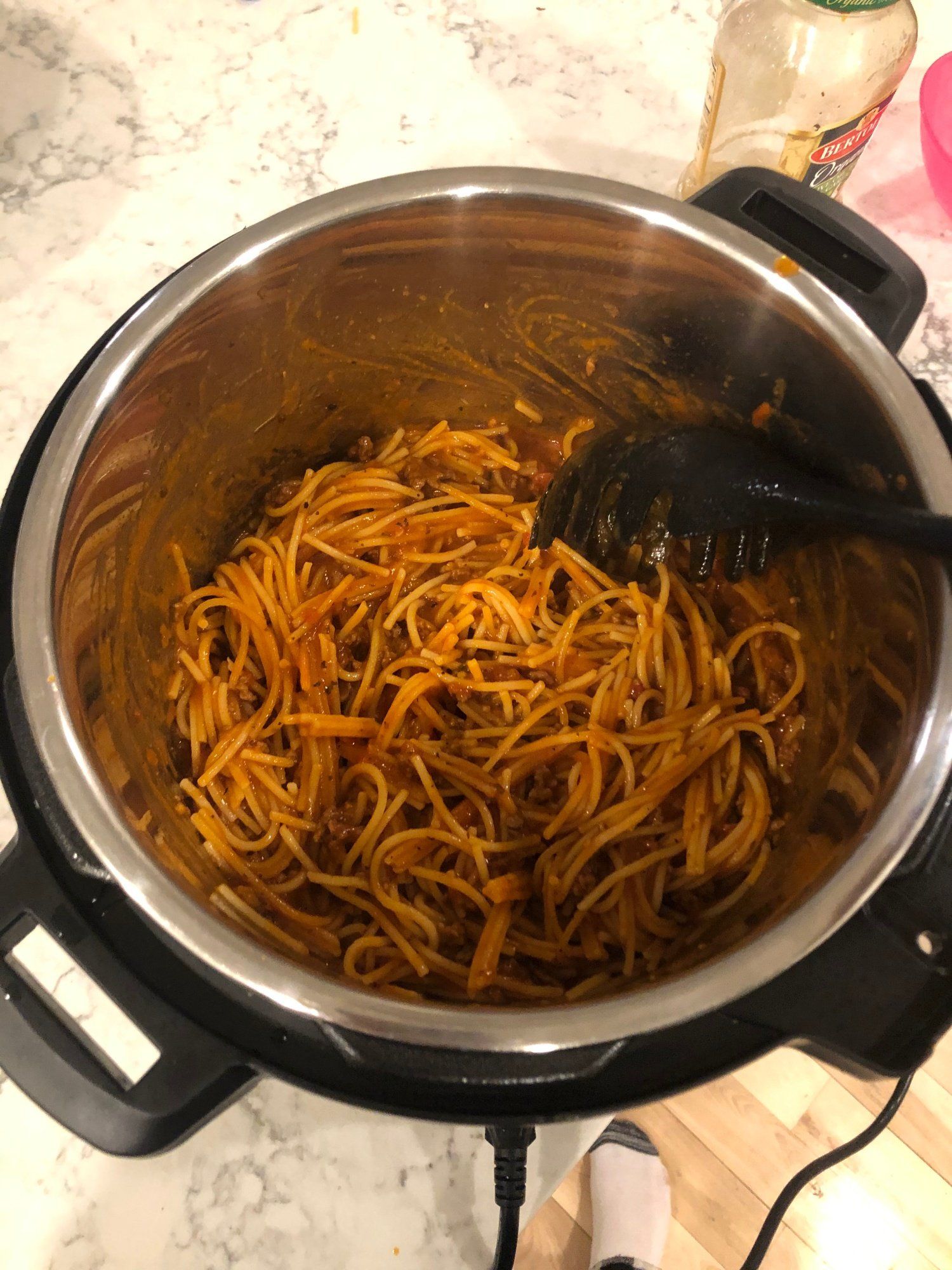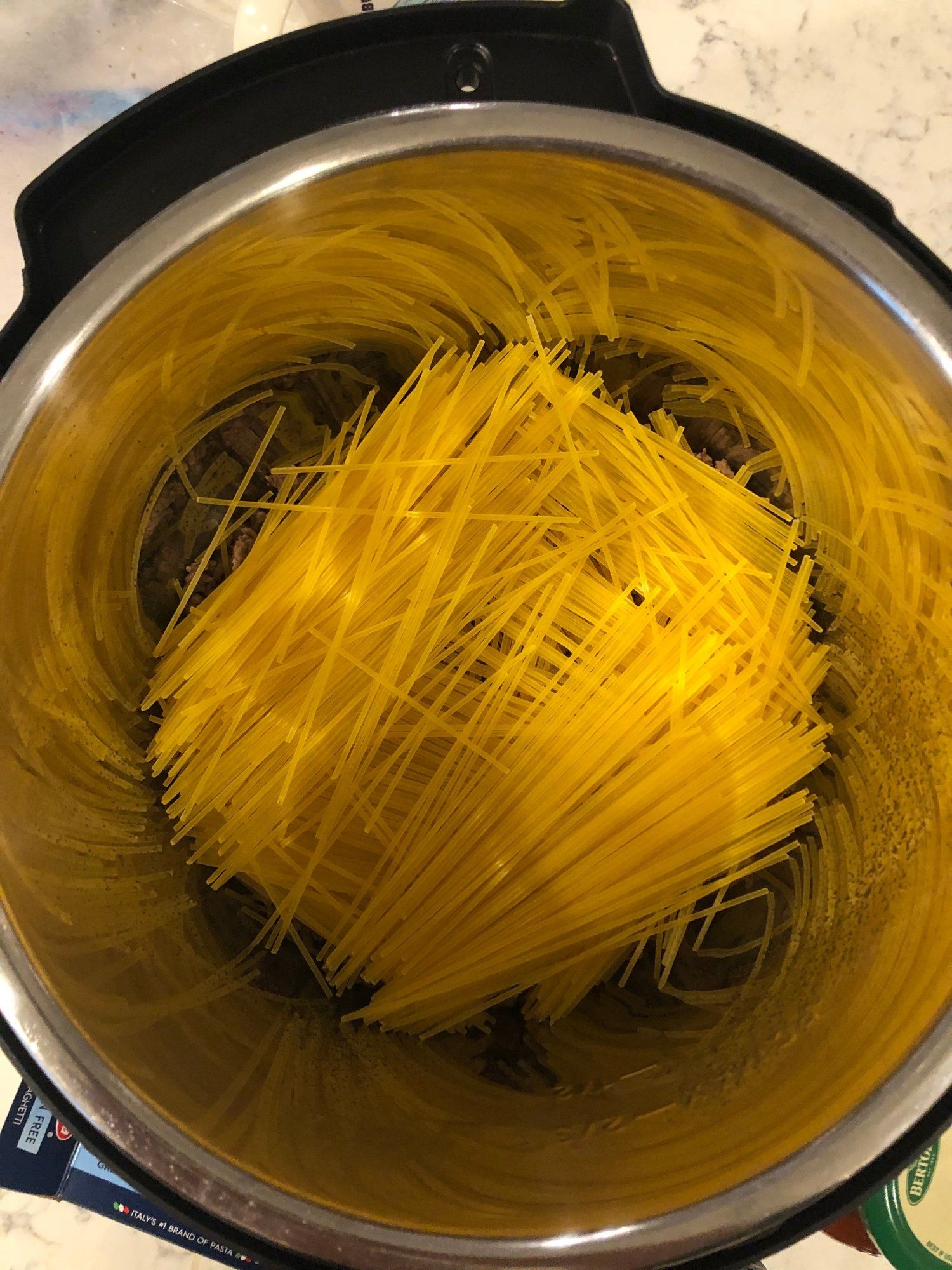 Dump the meat in — I have the 6 quart instant pot so it just fills the bottom. Then, break the noodles in half and layer them over the meat