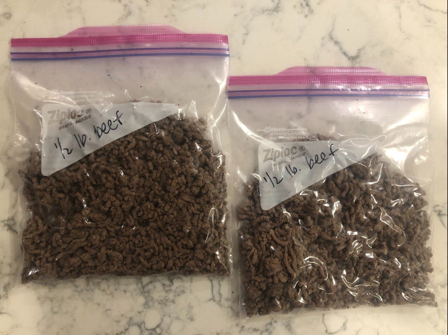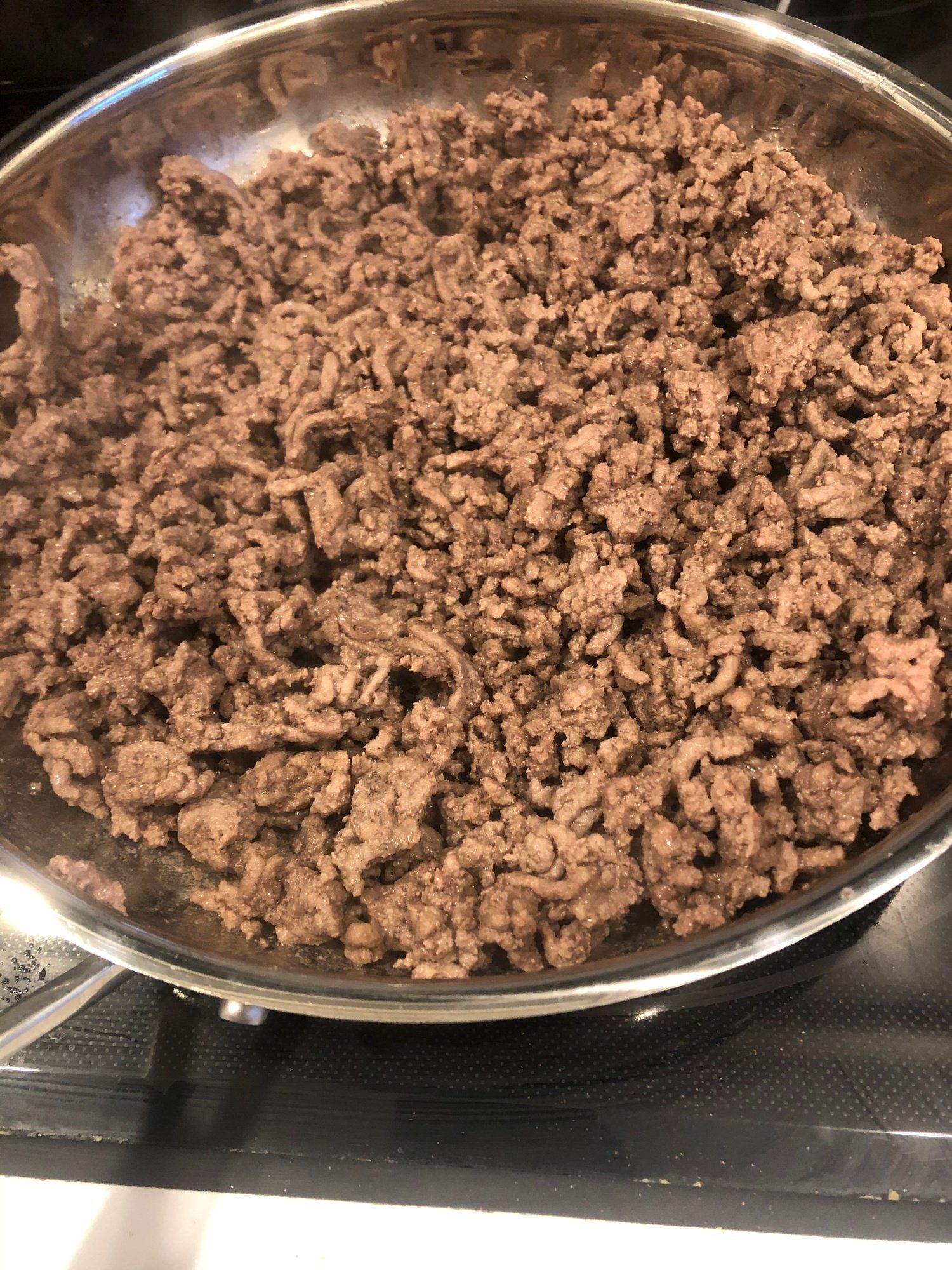 Brown the meat, usually/ideally way before dinner time. I actually split the pound of meat into two freezer bags, and then it’s super easy when it’s time to make dinner. 1/2 pound for this recipe seems to be perfect and feeds 4 of us, with leftovers usually.