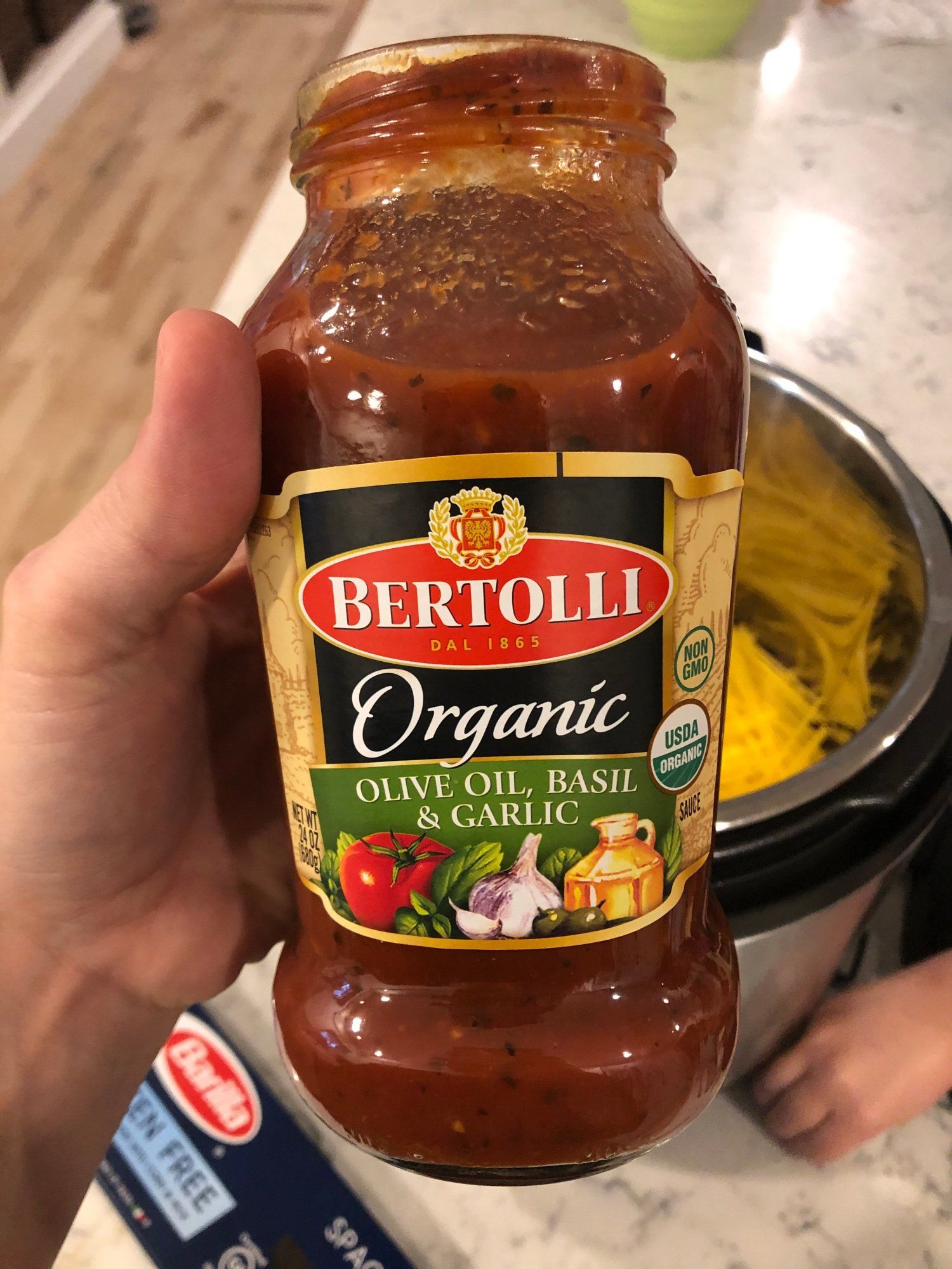 Then add a splash of olive oil over the noodles and try to mix the noodles around a bit. Next, dump a whole jar of spaghetti sauce over the noodles.