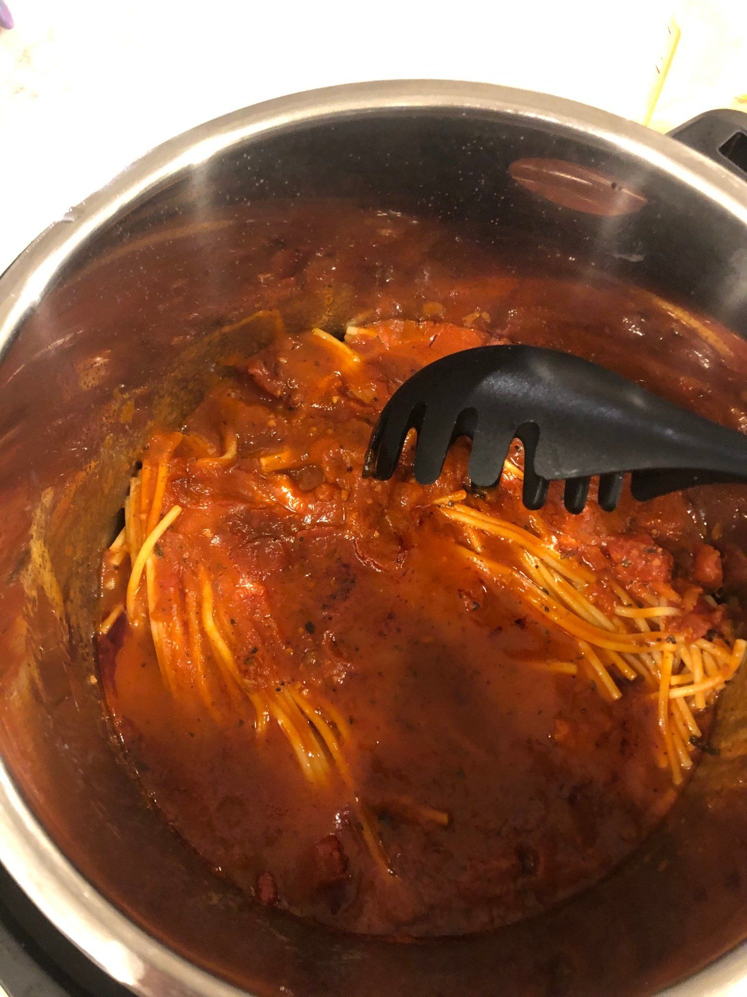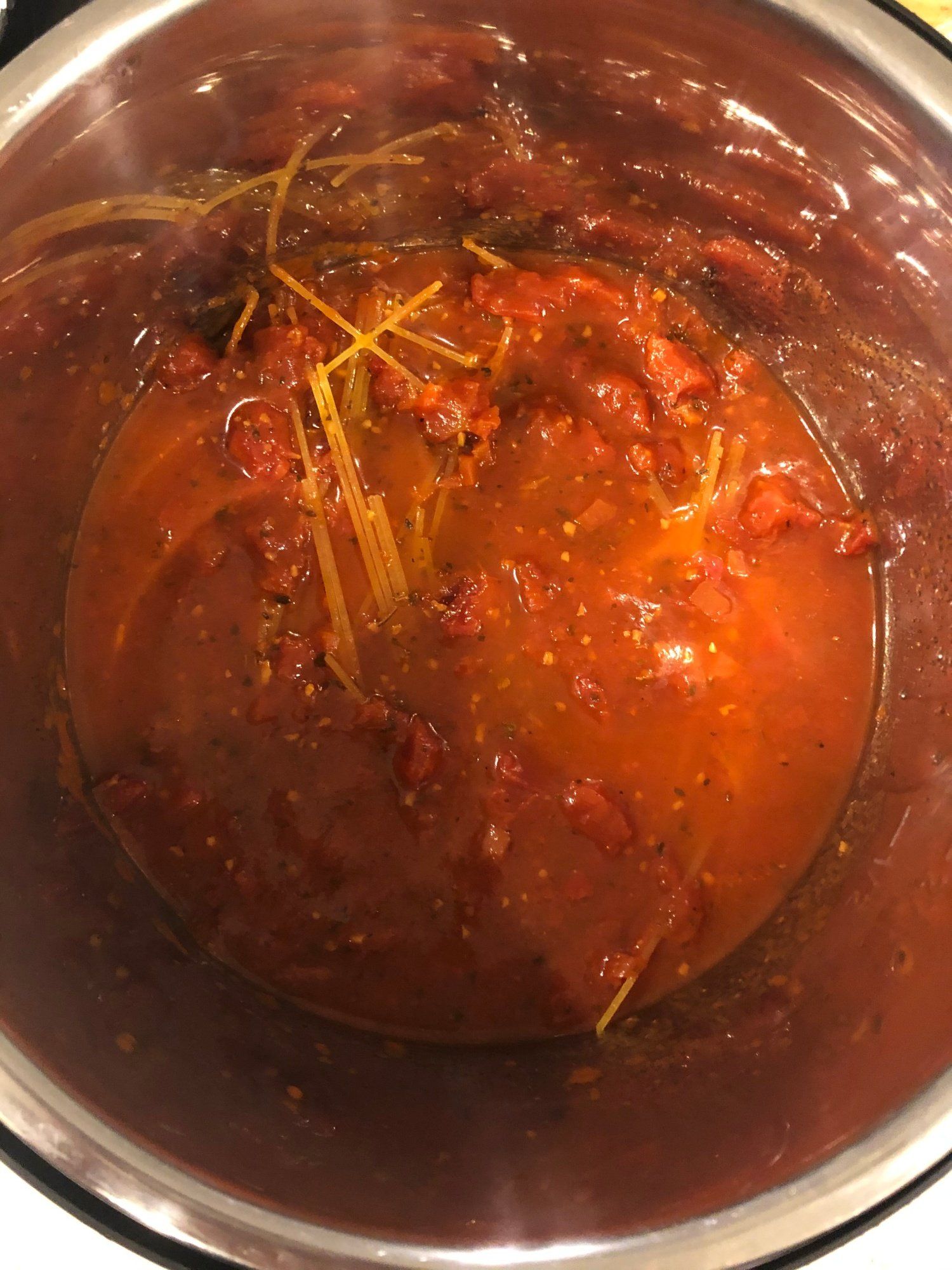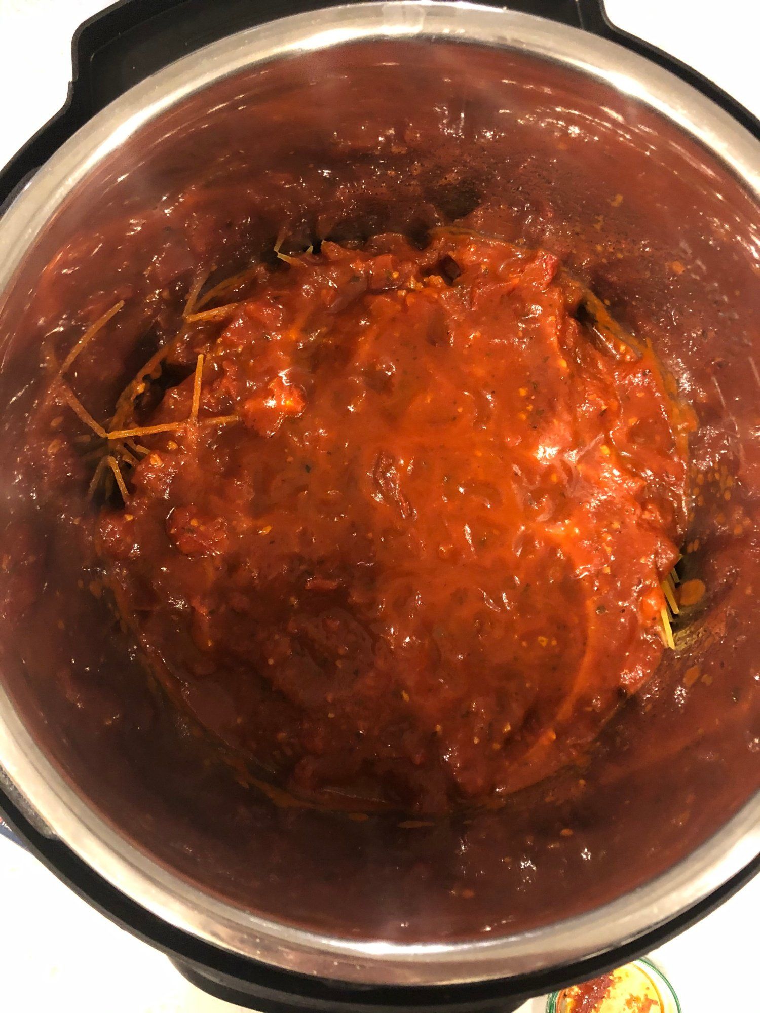 Fill a half jar of water, or a little more, and pour it slowly over the noodles – try to get all the noodles wet if you can. Full disclosure: you’ll probably have to play around with the water amount in your own instant pot to get it *just right.*