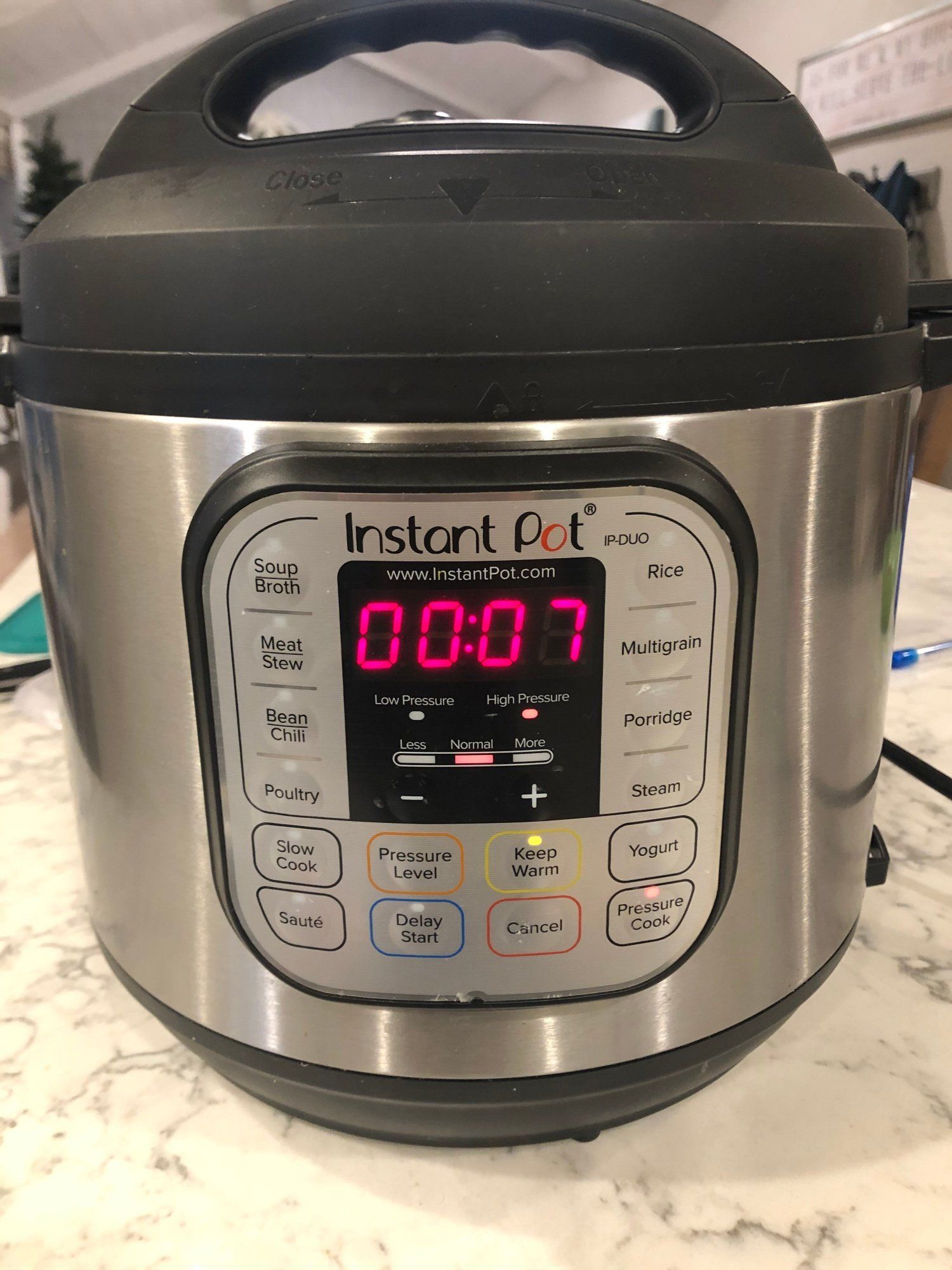 Then, make sure the thingamajig jig on the top is set to “sealing,” press “pressure cook” (high pressure), and set to 7 minutes — it will start automatically. After the pressure is built up, which takes some time, it will start counting down from 7. It usually takes about a half hour total. While it’s cooking, you are free to make a salad and garlic bread, sweat-free! 🙂