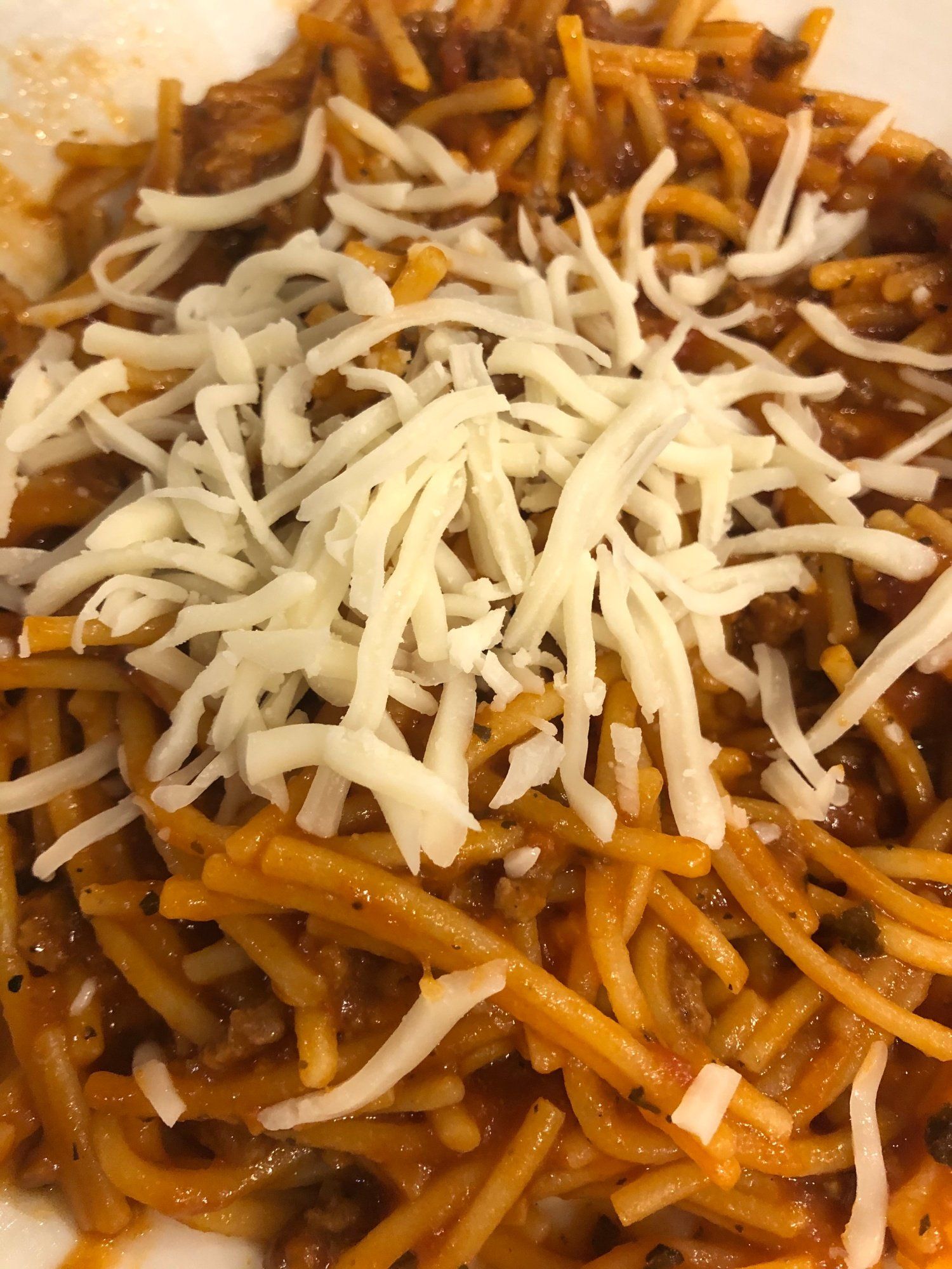 This is what you’ll need: 1/2 pound of browned beef, one package of 12 oz noodles (*gf or regular), 24 oz jar of spaghetti sauce (any kind), a splash of olive oil, half jar of water, and that’s it!