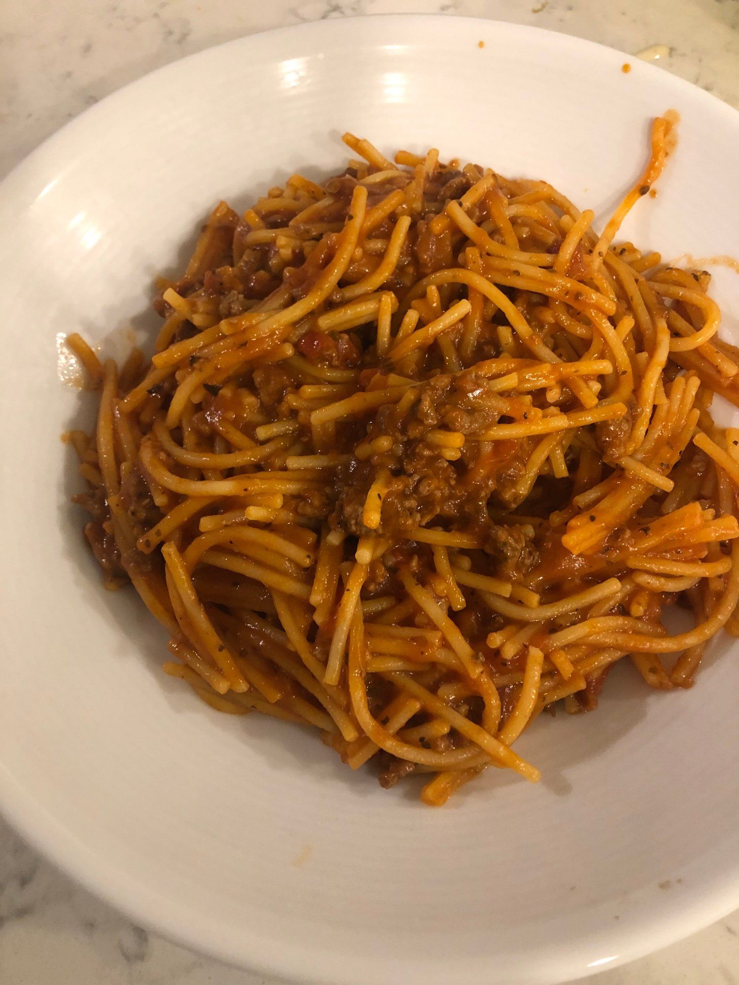 Okay so you know how everyone says spaghetti is suuuuch an easy meal to make?! *eye roll* I do not agree. Let me paint you a little picture of how spaghetti night used to go for me. I would have one pan browning the meat, one pan for gluten free noodles (for Cor), one pan for regular noodles, another microwavable pan to heat up the sauce *at just the right time*, a cookie sheet for garlic bread to put in the oven *at just the right time*, oh and don’t forget to make a salad! Time to strain the noodles! Now the timer is going off for who-knows-what. Don’t forget to flip the garlic bread! Baaaaaah! I’m sweating just thinking about it. Is there anyone else out there who feels like it was a lot to manage???!! I know I didn’t make it easy on myself by making two kinds of noodles, but even when I made one, it was stressful. Not to mention, the clean up! So. many. pans.