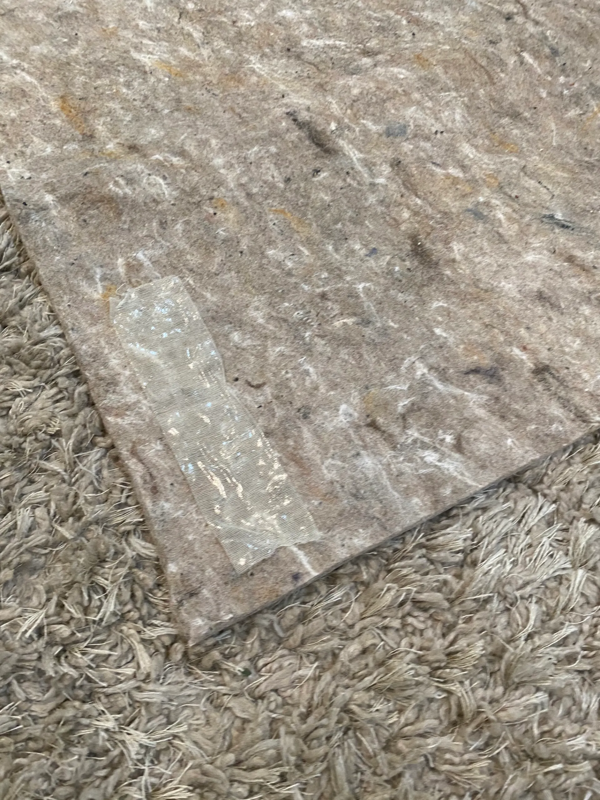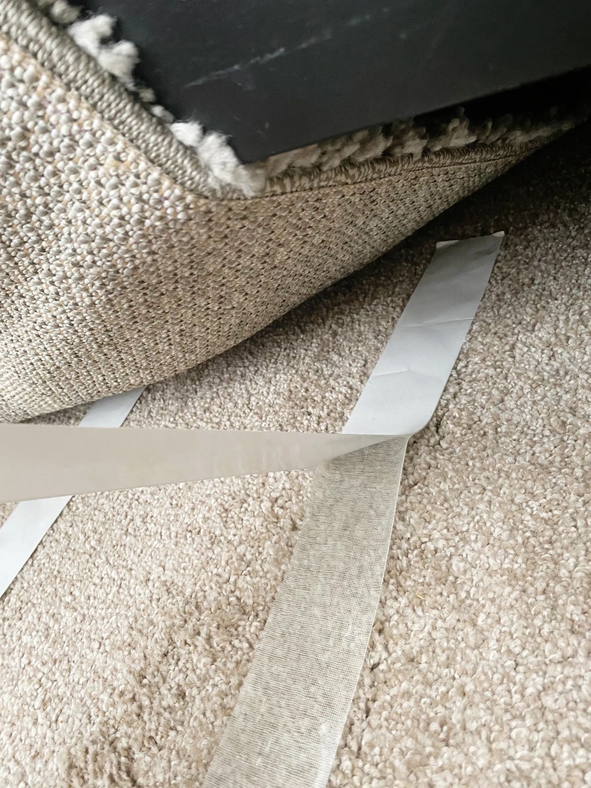 It’s pretty self explanatory, but we put several strips down on the problem-area, basically laying it the direction the rug needed to be tugged, like so: