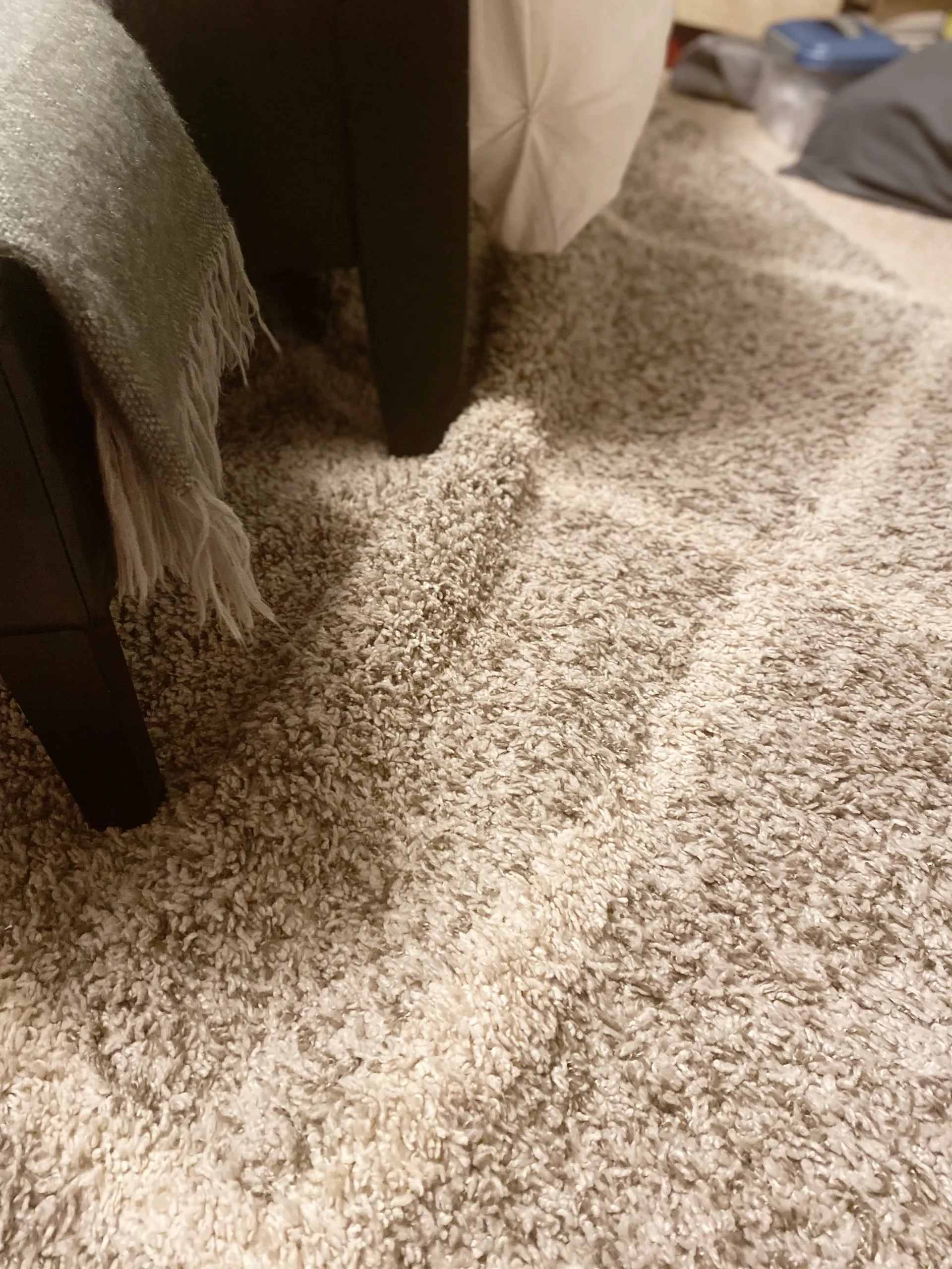 We have a large area rug in our bedroom that just wouldn’t. lay. flat. I tried all the tricks — laying heavy things on top, pulling and yanking, heat, moisture, and we even rotated the entire rug (which isn’t easy, since it’s under our bed). We thought it might be caught on something under the bed, which was causing it to buckle, but rotating it didn’t work either. I could have cried about it.