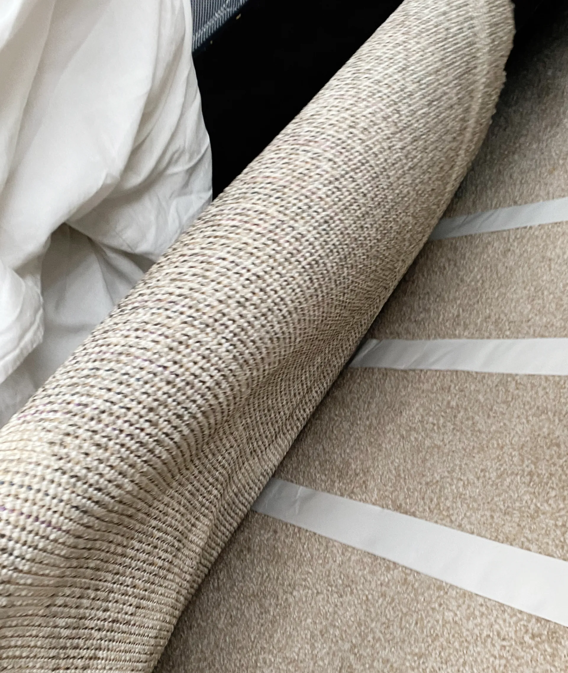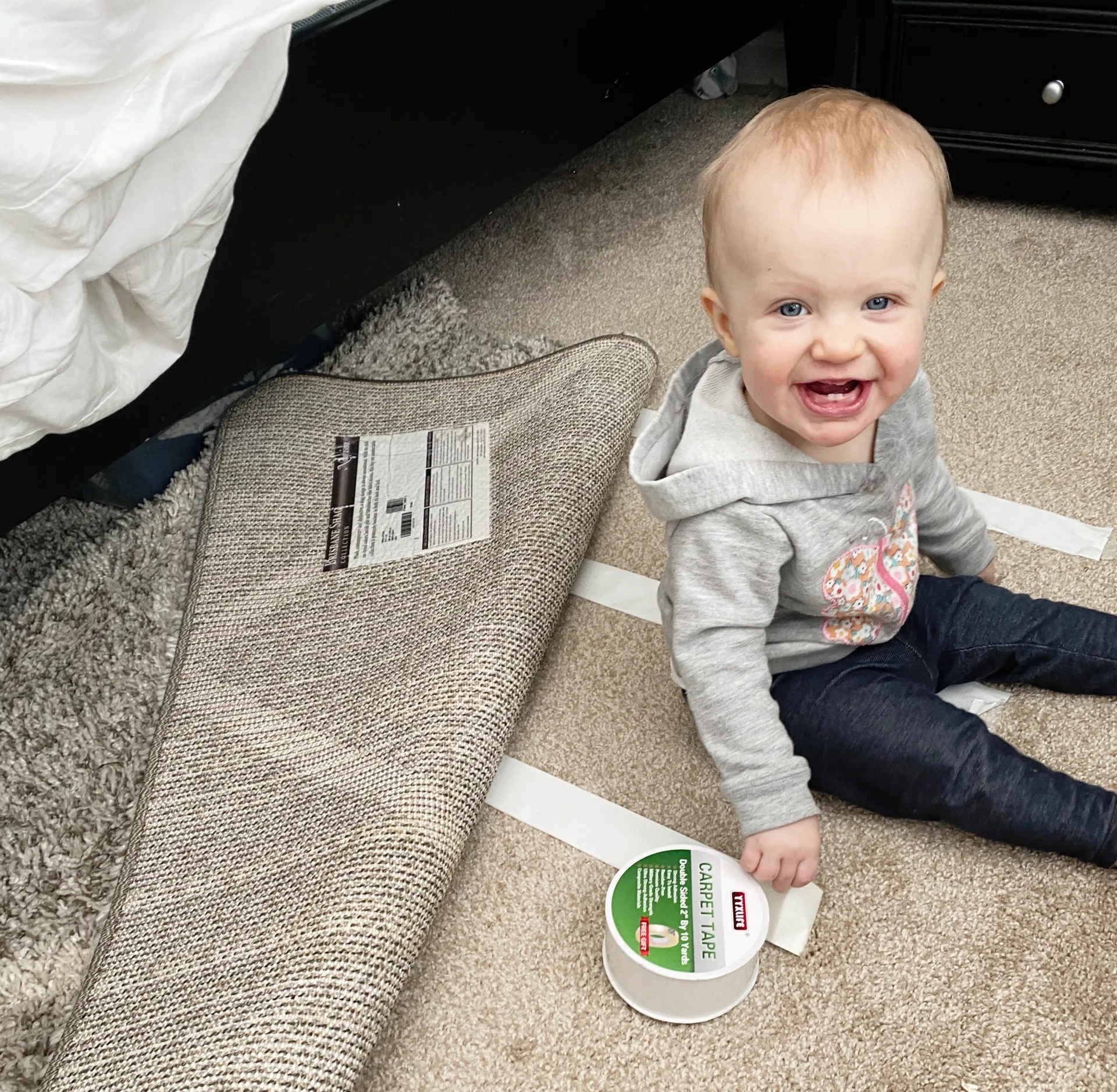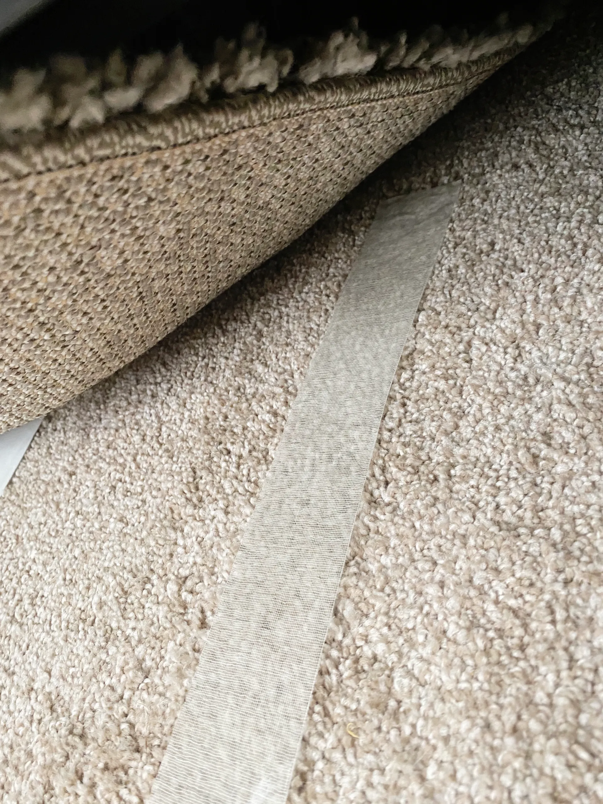 But have no fear…we found a solution! When all else fails, buy Carpet Tape!! Did you know this existed?? I sure didn’t. I knew there was non-slip tape for rugs on hardwood, but I didn’t know you could tape carpet to…carpet!