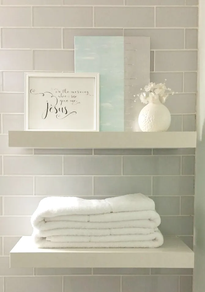 - Decorated (Me, me, me! That’s the one thing I did!) OH and I sealed aaaaaaall the grout on the floor and accent wall, which is no small task. If you’ve never done that, I basically had to take a tiny paint brush and paint the grout sealer on ALL the grout lines. It took a WHILE. There are better ways to do that now, I’ve heard, or special grout you can buy so you don’t have to do that — thank goodness!! Anyway, I also caulked and painted. We make a good team, although Cory definitely is the All Star.