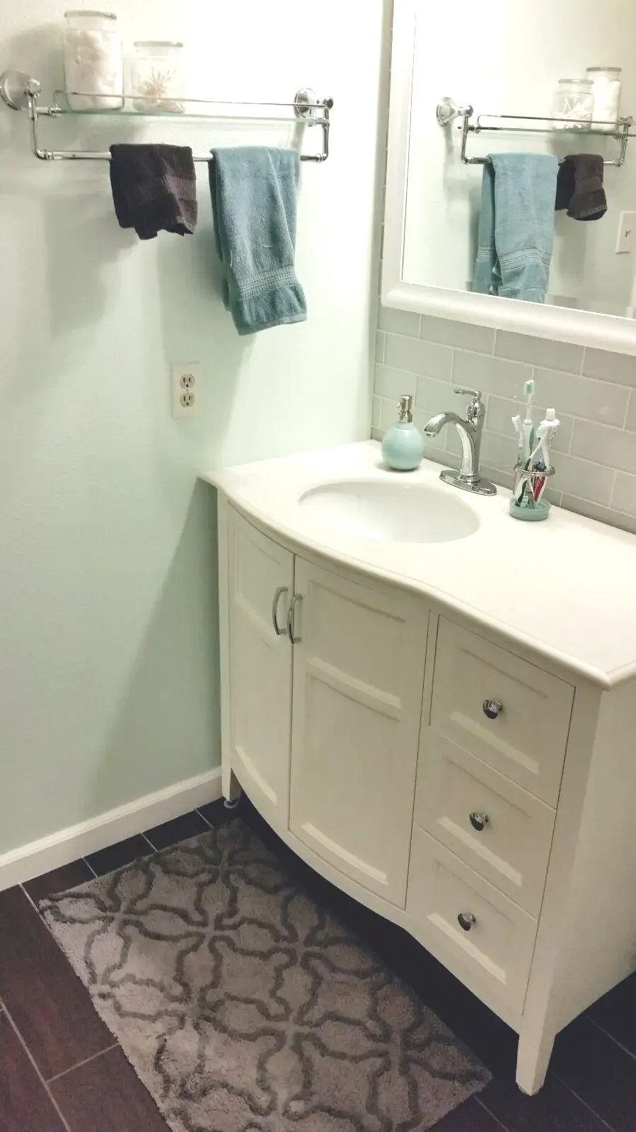 Then, to complete this “first step” of the transformation, we painted the walls, the vanity, and the mirror trim. Basically anything we COULD paint, we did, since paint is such an easy and inexpensive update. At the time we thought it was a big improvement, and it was!