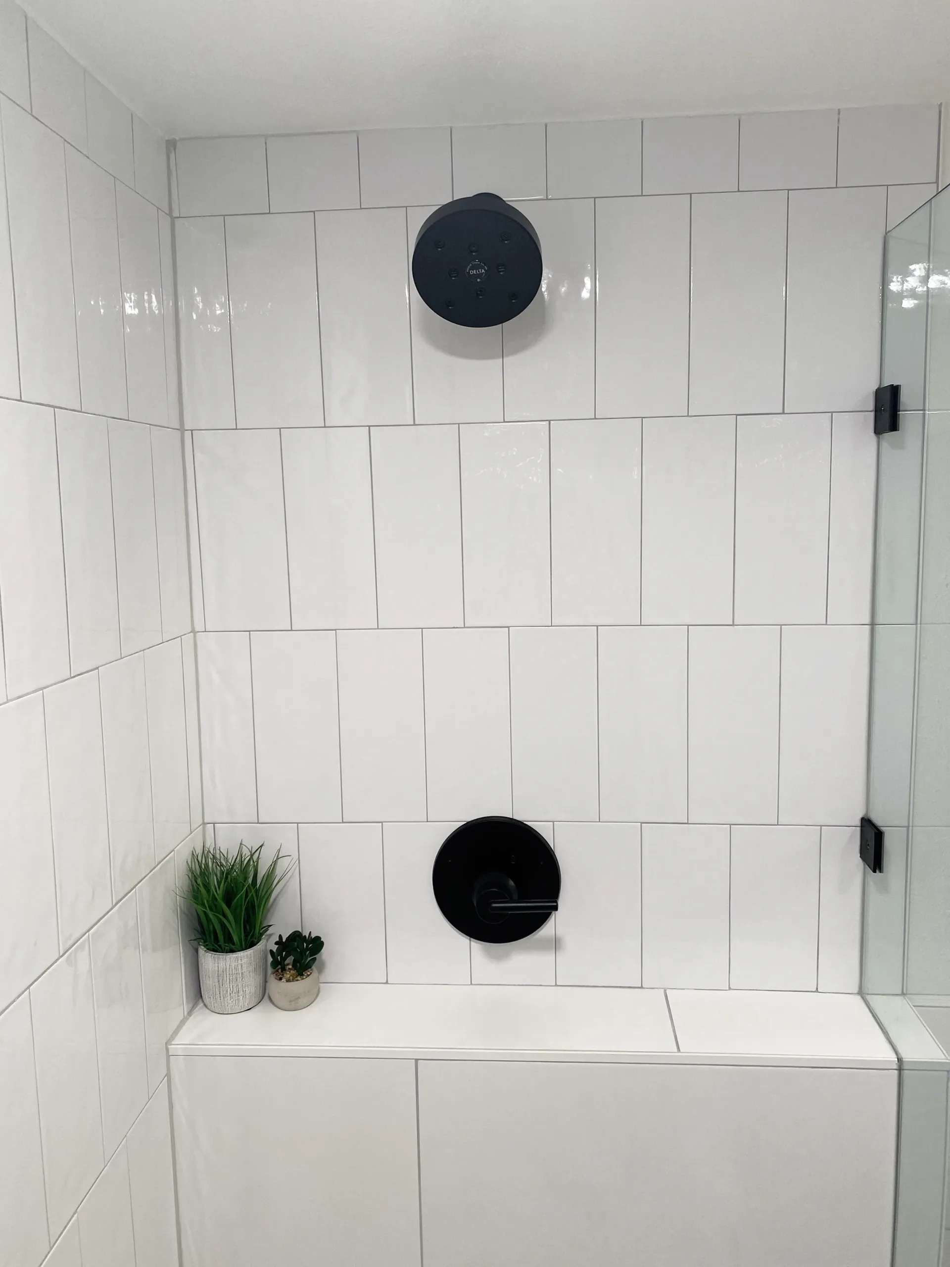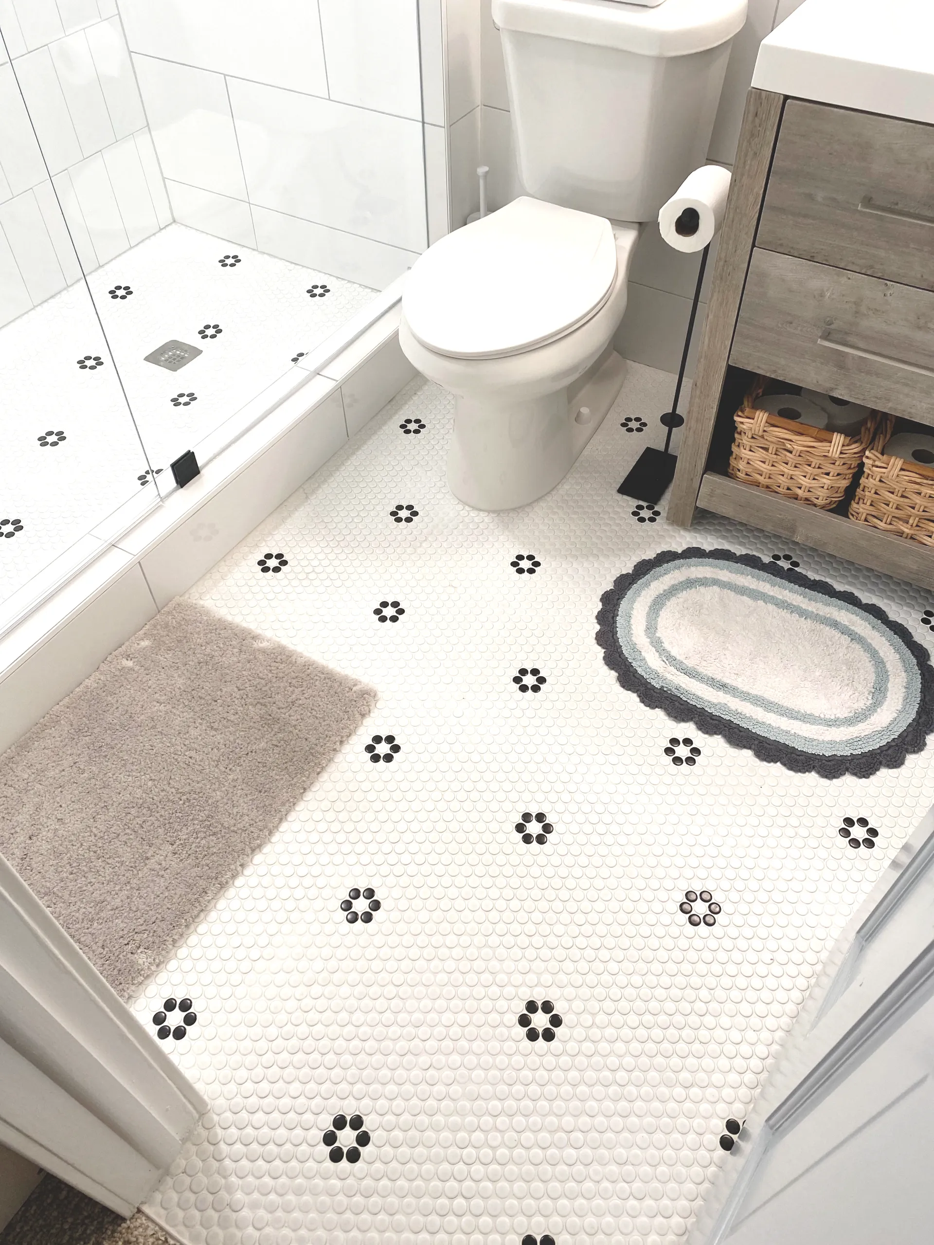 The trickiest part was planning out exactly how the flower pattern would line up. Now, I’m a little anal I’ve been told (even though I HATE that word), but I wanted to make sure the flowers were centered, length-wise and width-wise, in the shower and bathroom. It may sound or look like an easy thing but it definitely took some time, and now I’m BFFs with the tile guy (or maybe his worst nightmare?!) lol.