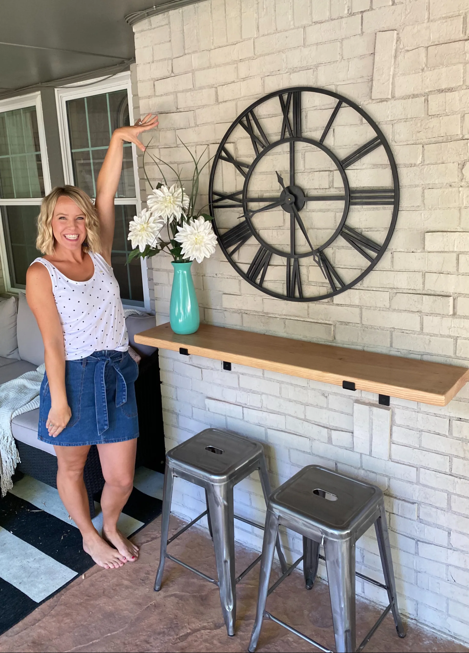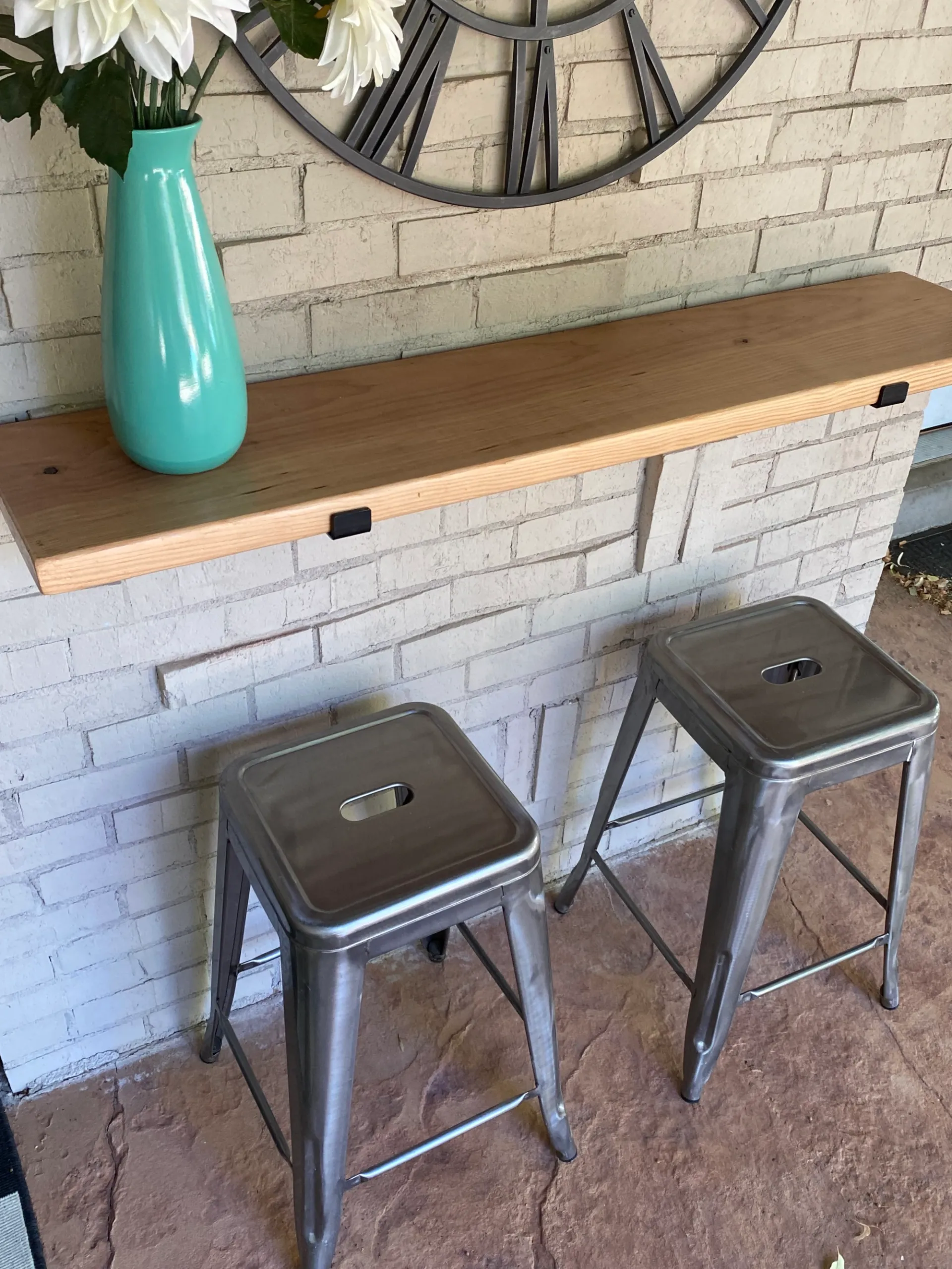 It’s a little trickier with brick, like we did. Cory had to use a masonry drill bit to make a hole, then added wall anchors, and then screwed it into the anchors. If you’re doing this to a wall, it’ll be much easier than brick, but doable either way! - Add some decor and/or something fun above the bar and Voilà!