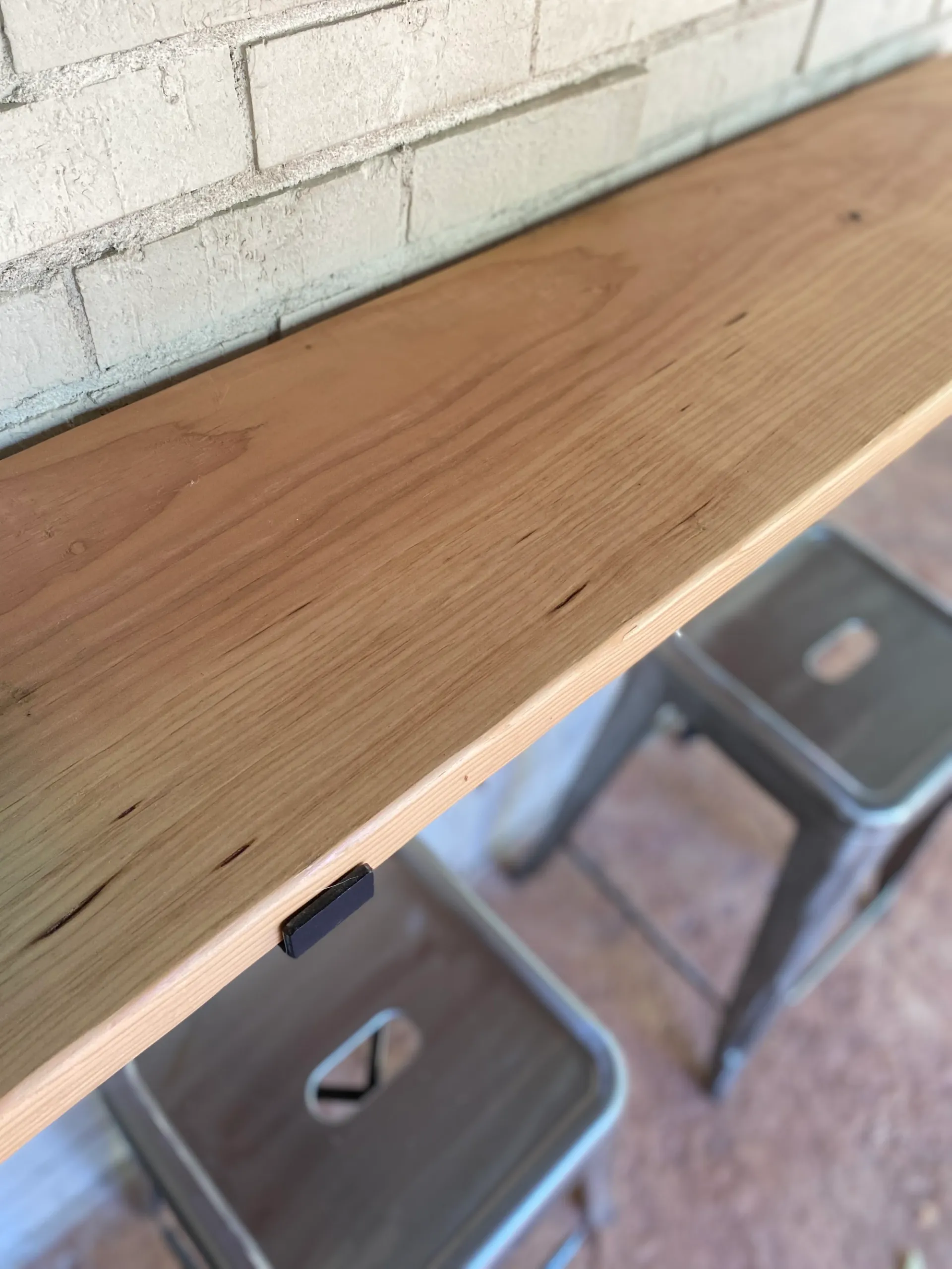 We bought a 12 foot piece of wood, so were able to cut it in 3 equal pieces of 4 feet each, which was perfect for this section of the brick wall. And now we still have two extra boards ready for those extra brackets – perfecto!