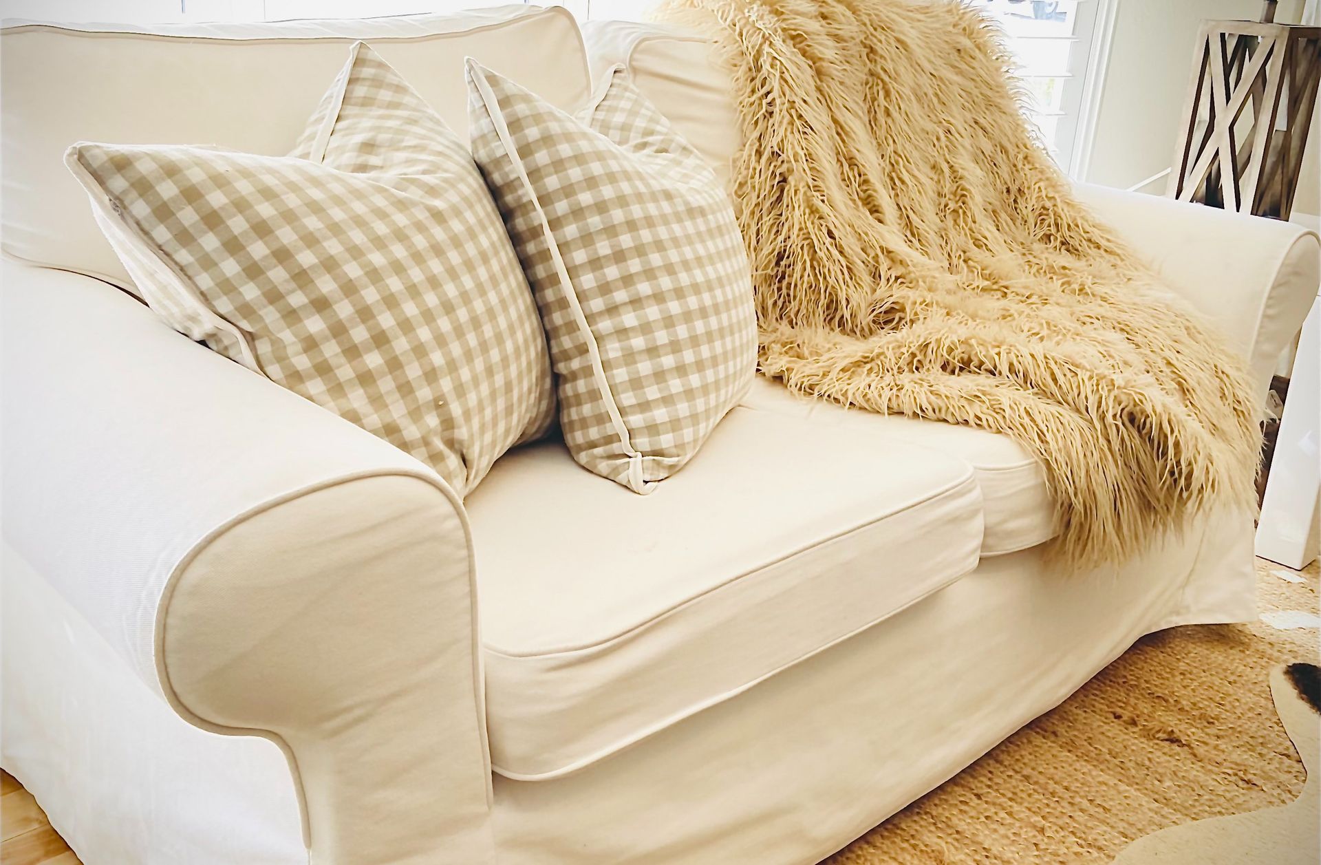 - I recommend white couches or chairs with slipcovers. Every-so-often I throw my slipcovers in the wash to freshen them up, and get any stains or dirty-spots out. The white furniture DOES get dirty, just like they all do, but how awesome is it that you can WASH them??! And then they look and smell brand new! Ahhhh…