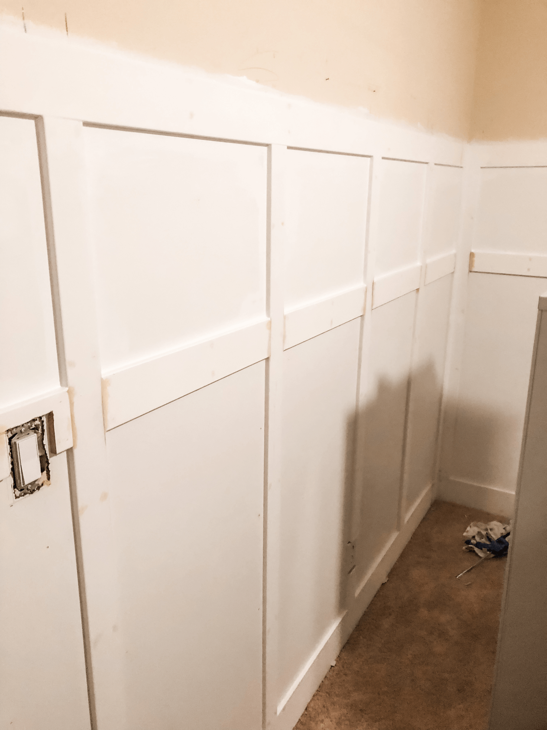 The first step was to add board and batten to the room...which is my faaaavorite way to enhance a room. It just screams *nursery* to me, for some reason. At our old house, we did JUST the vertical and horizontal trim boards (without a panel board), but in this room we added white panel boards behind the trim. I truly feel like either way looks great, but I especially recommend the panel boards if you have highly textured walls. Let me know if you want a more detailed tutorial on adding board and batten, but it's totally doable! 🤗