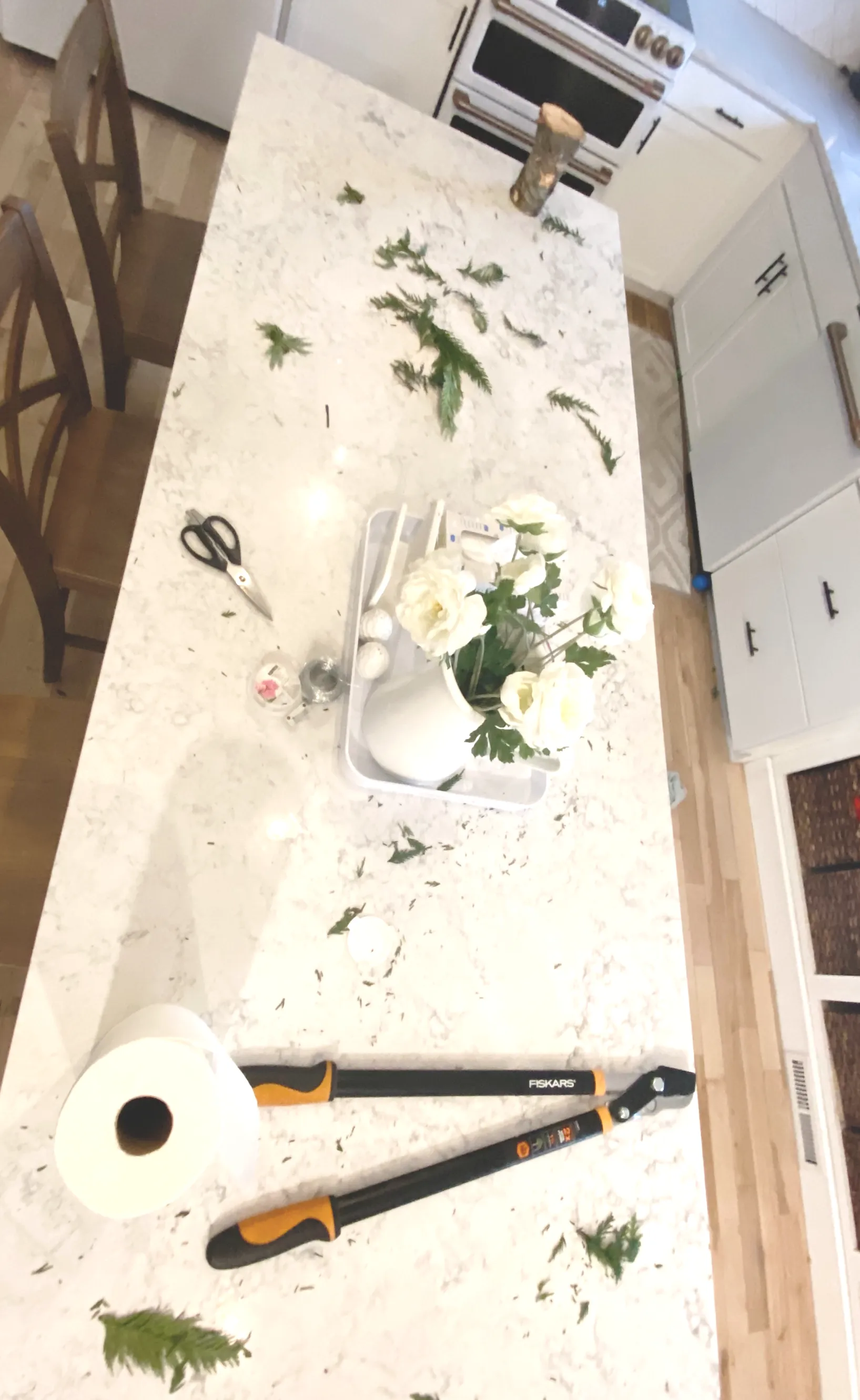 Then I held up the garland to measure how long of a piece I needed, and used our giant “loppers” to cut the garland. I used a heavy-duty scissors for a few pieces, too.