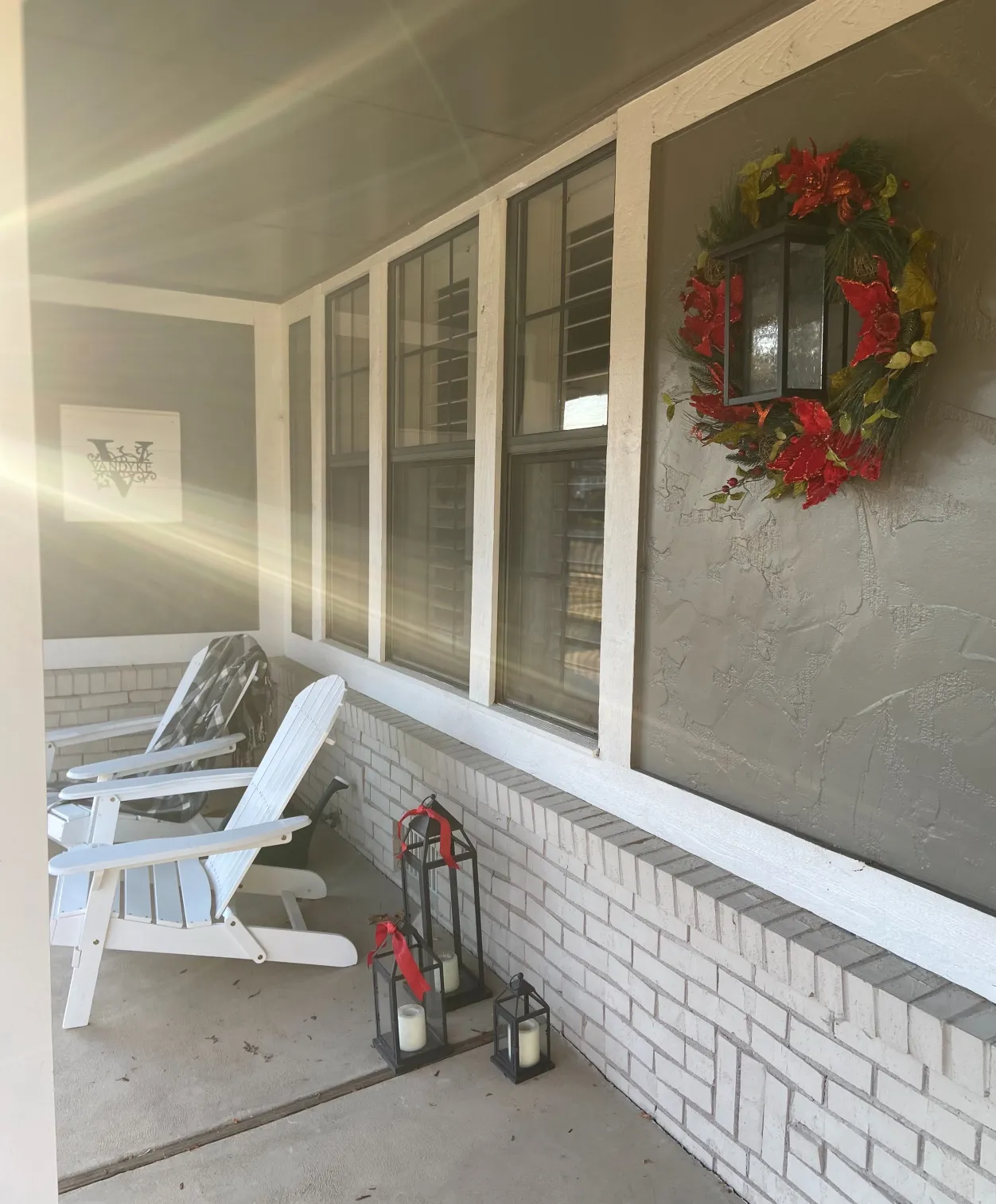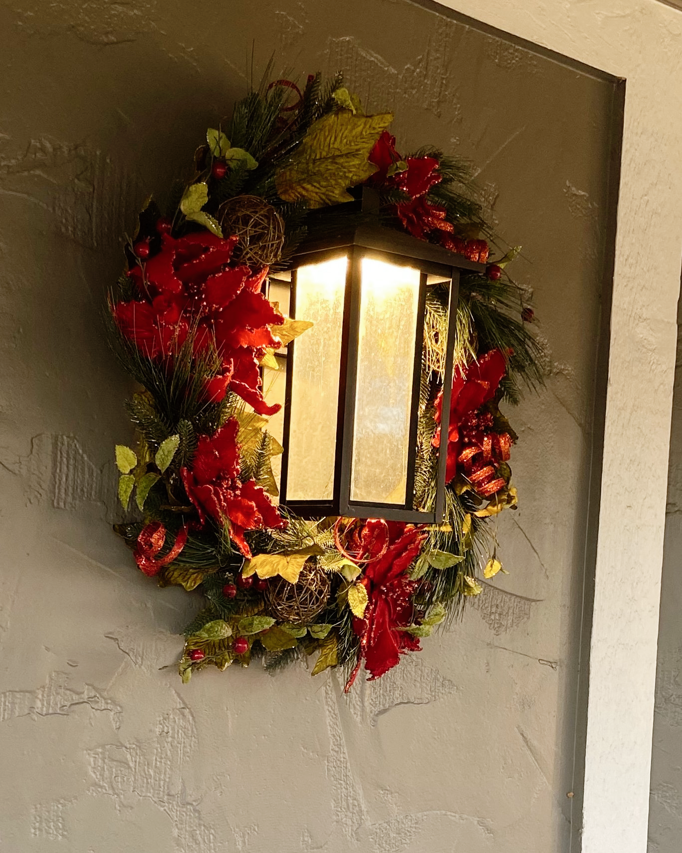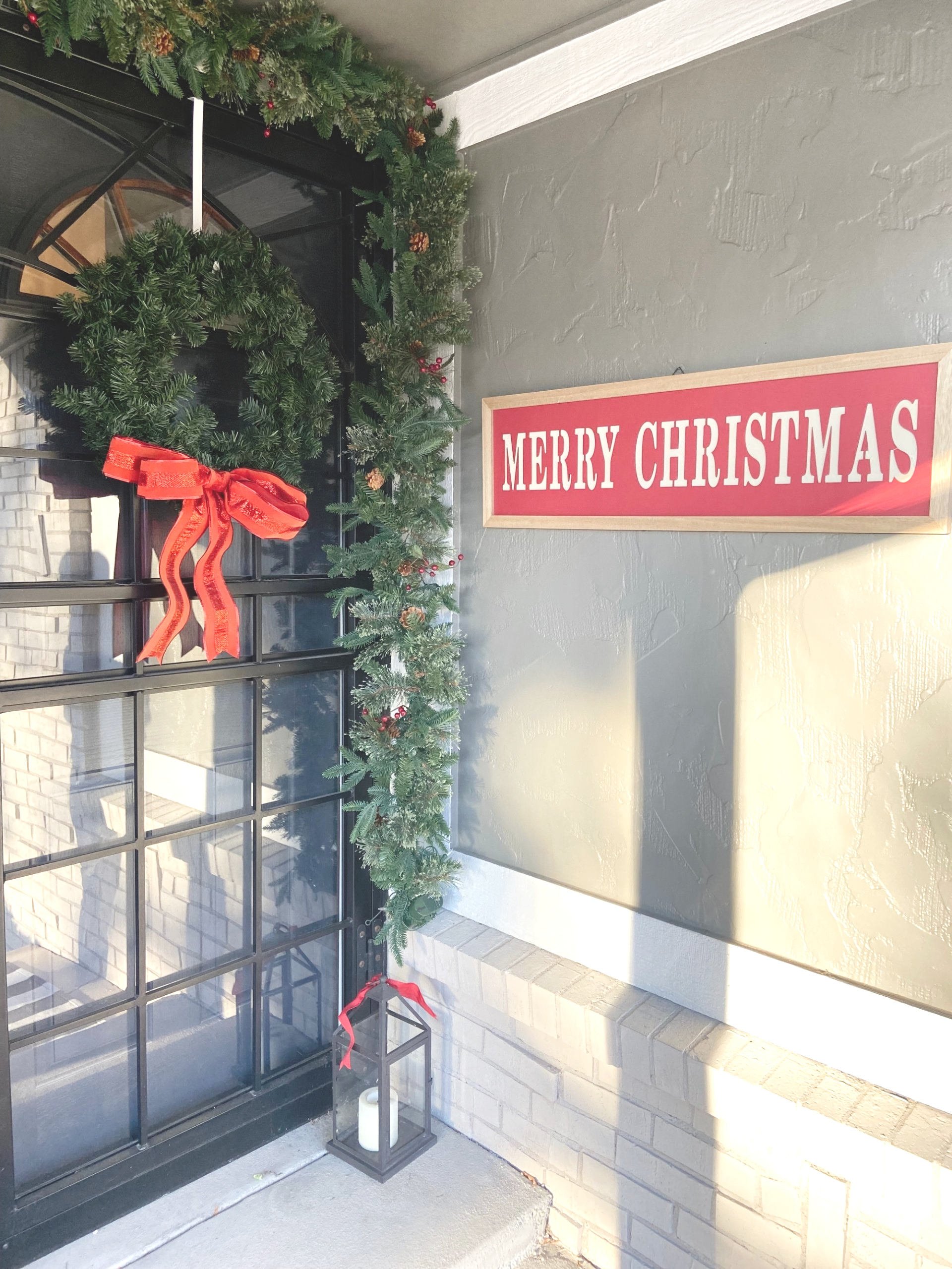- Find a fun Christmas sign, lit greenery, and front door wreaths, of course!
