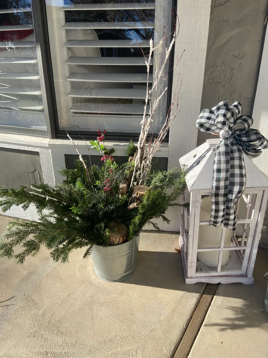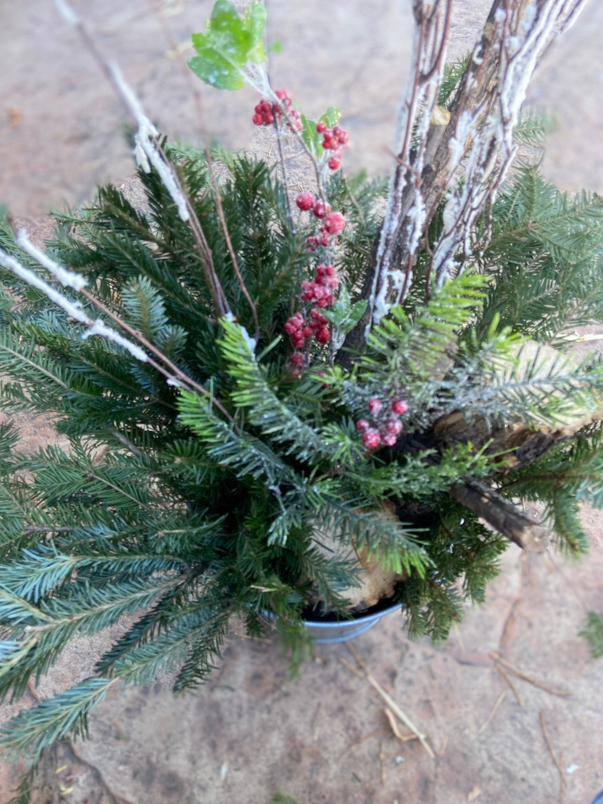 Then use a loppers or garden trimmer to cut down the greenery. I started with big pieces, but that looked weird. Just get creative and arrange it however you like. I had a small selection of random (fake) snow-covered-branches and berries I had gotten from Michaels a few years back. I’m not going to lie, when I first started arranging, I was thinking to myself, “welp, this looks dumb,”