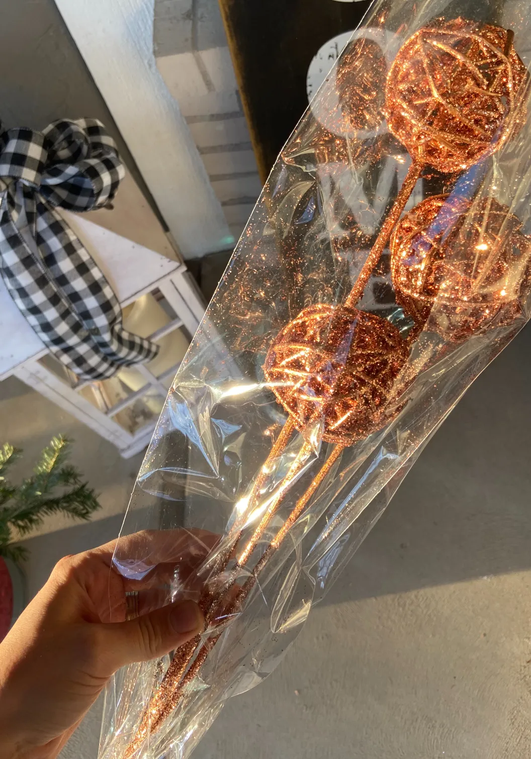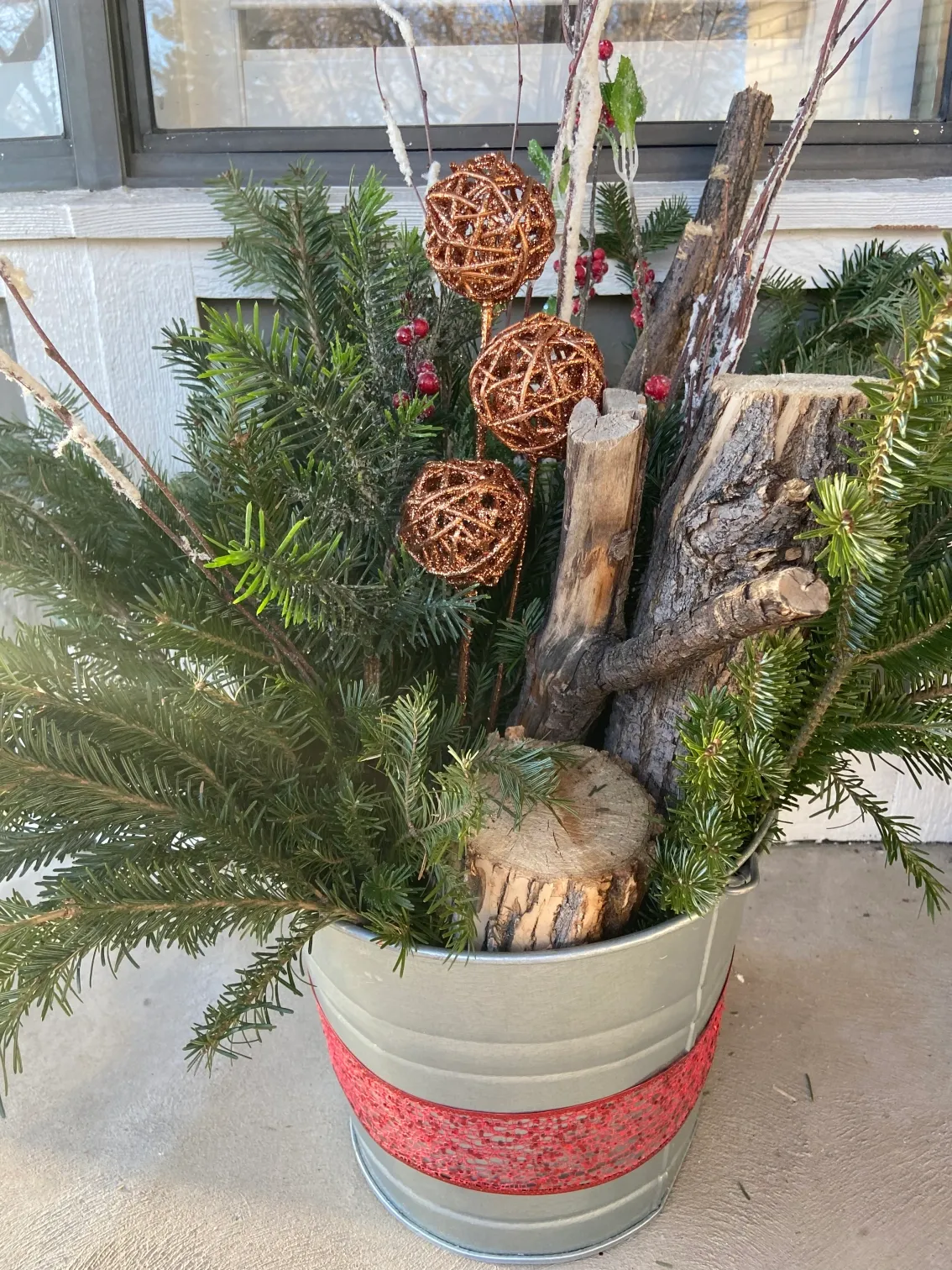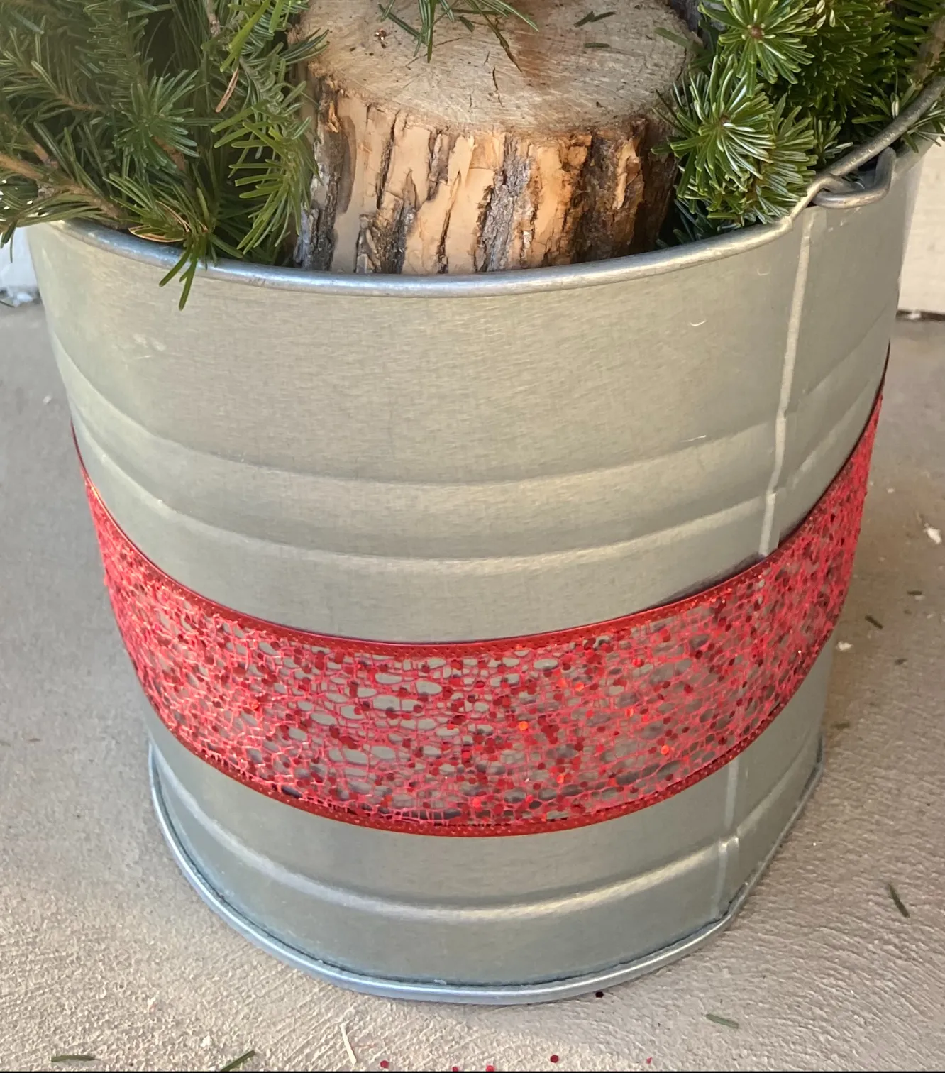 I brought it out to the front porch and realized it needed a red accent so I put a ribbon around the bucket and purchased some $5 glittery gold balls from the grocery store.