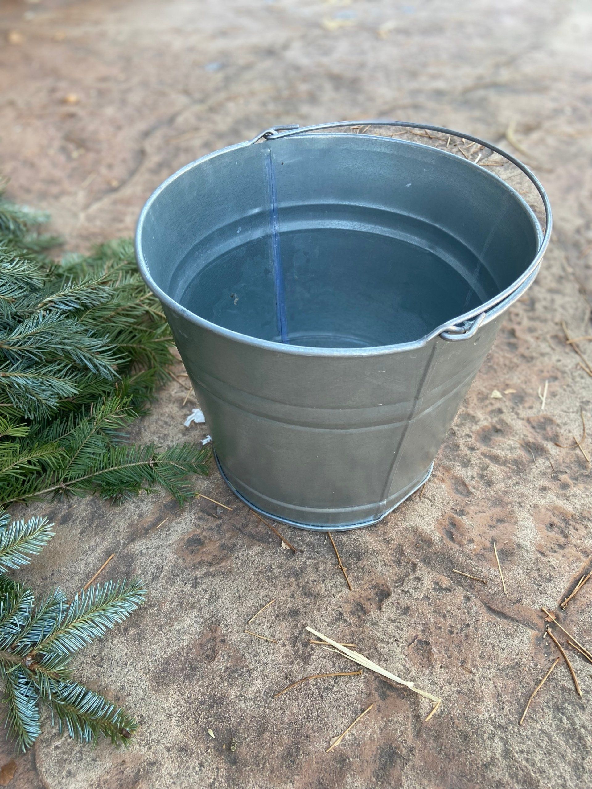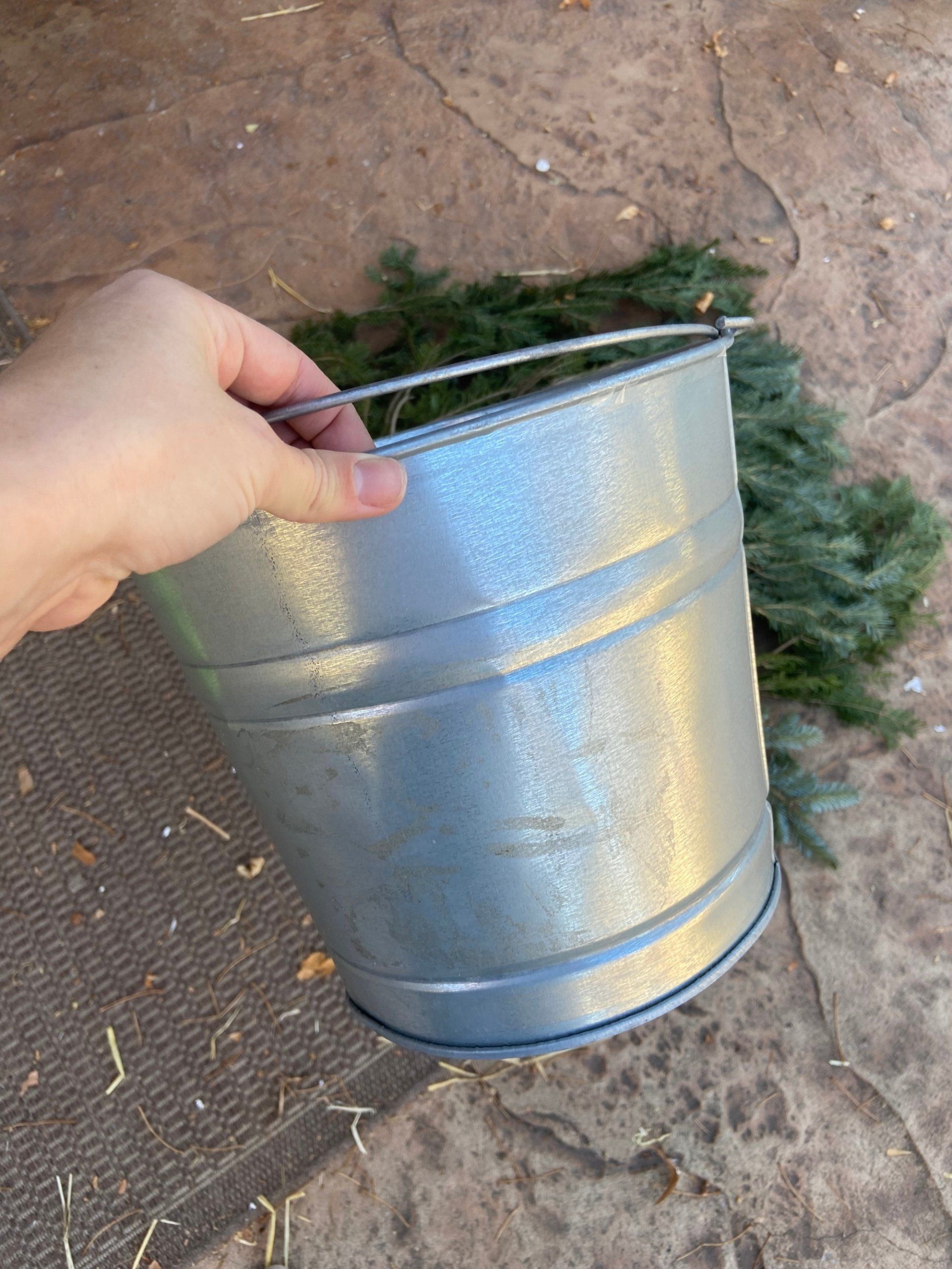 The first step would be to fill the bucket with some bigger branches or small logs, if you have them. We happened to have these random logs laying amongst the kids’ toys outside –- husband, I’m lookin at YOU -- what are they doing here?! haha. I hope you didn’t need them, because they’re now part of my decor.